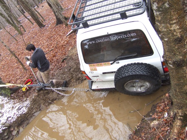 So: You have defined the situation as a vehicle high-centered on a stump. Time to formulate a plan. You have determined that you cannot use a kinetic rope, because the vehicle is firmly grounded on the obstruction and to simply drag the vehicle off could cause damage to the undercarriage. Same reasoning applies to the winch: You don’t want to simply drag the vehicle, and while it is possible to lift a vehicle with a winch, it’s not as easy as it looked in The Gods Must be Crazy.