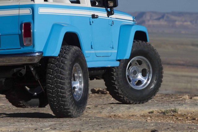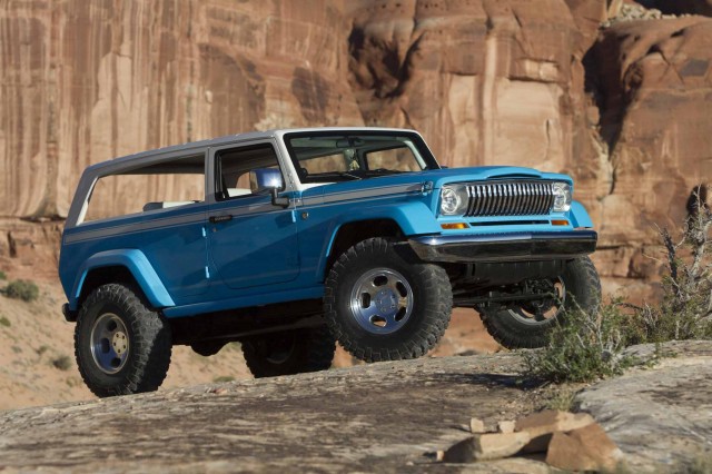 A visage of the past, the 1970s inspired Jeep Chief borrows heavily from the classic lines of the original Cherokee. Based on a Wrangler chassis the Ocean Blue exterior white top and chrome bumpers front and rear give the Chief a timeless presence. A subtle beach theme graces the interior with a Rosewood passenger grab handle and tiki-style shifter. A Uconnect 8.4-inch touchscreen media console keeps the vehicle up to date, but this truck is all about classic appeal.