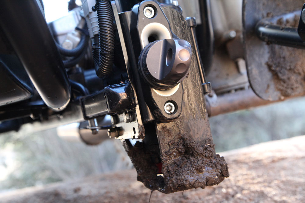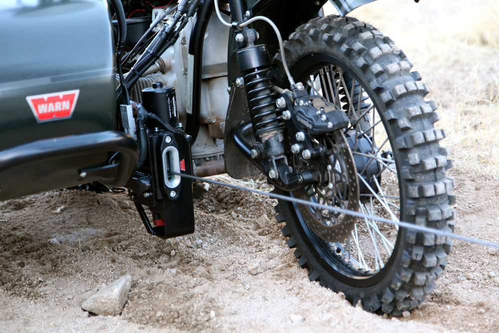 At the heart of the system is Warn’s ProVantage 2500-S winch fitted with 50 feet of synthetic line. Designed for ATV use, it is a compact winch with all the power required to extract the Gear Up from any potential recovery situation. Installation of the winch and its various components did require some creating thinking, but mounting options abound on a platform like the Gear Up. One of the more delicate components, the winch solenoid, was placed in a protected location beneath the seat giving easy access to the battery terminals just below. The handlebar switch was mounted by the right-hand controls providing easy access to the winch functions without compromising the ability to work the throttle and brake. The more complex issue to be resolved was how to route the winch wiring leads. Using large gauge Anderson plugs for maximum durability, the winch can be quickly disconnected for an easy transfer from one end of the motorcycle to the other. This also facilitates easy removal of the winch if it is not needed for a given ride.