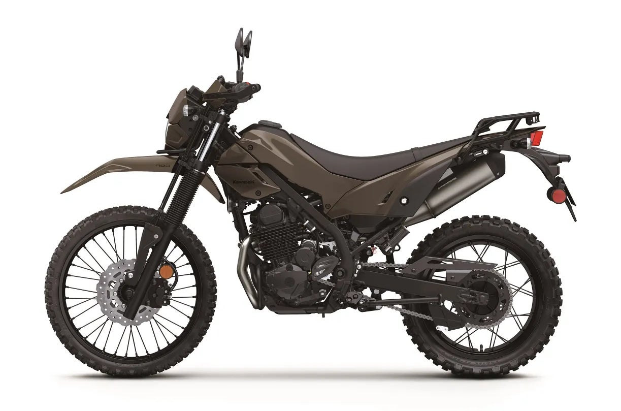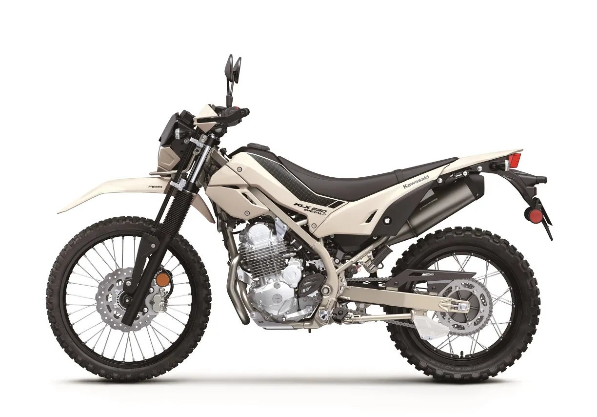 In perhaps a reluctant nod to modernity, the newest KLXs get LED headlights, digital dashboards with smartphone connectivity, and ABS that’s easily turned off with a dedicated switch (no menus to navigate here). Eschwing Kawasaki’s sometimes garish paint schemes, there are only two muted colorways available: beige for the Sherpa S and brown on the DF. Pricing is appropriately modest for such straightforward motorcycles. The Sherpa S starts at $5700, and the longer-travel DF will set you back just $100 more.