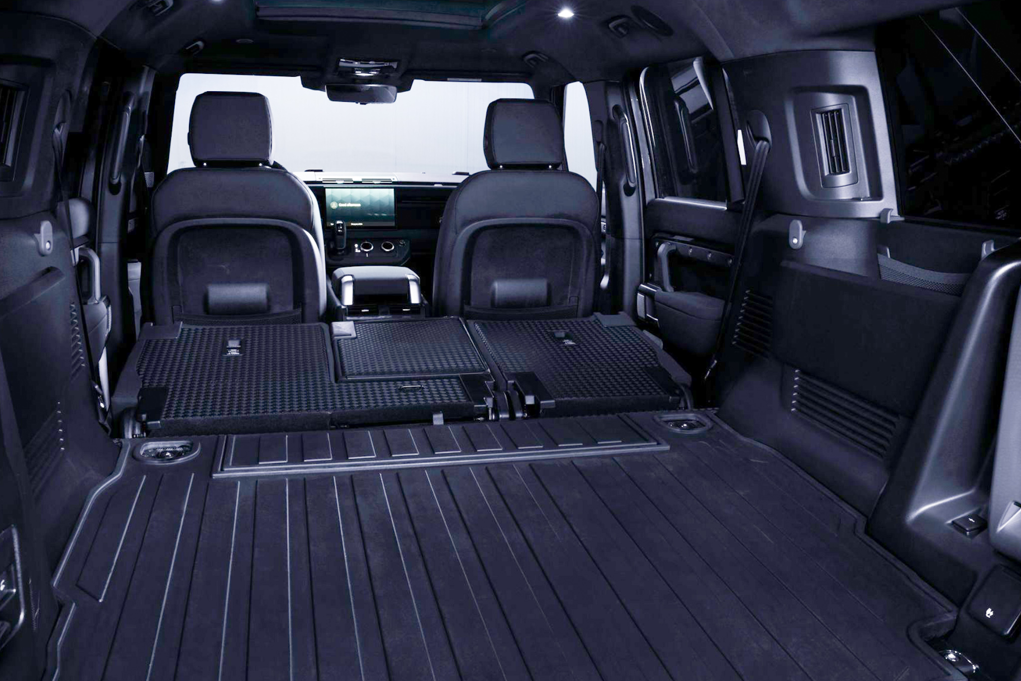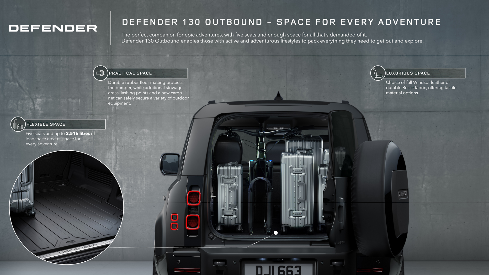 The new Defender 130 is exceptional as a travel vehicle, providing capability that few in the segment can match, combining a class-leading 1,830 pound payload (5-seat, 6-cylinder) with an unmatched 370 pound dynamic roof load rating. There is up to 88.5 cubic feet of storage behind the first row, and over 80 inches of length for sleeping on a flat load flood (5-seat). If you like to tow, the 130 can drag 8,200 pounds of boat, camper, or car-hauler behind it.