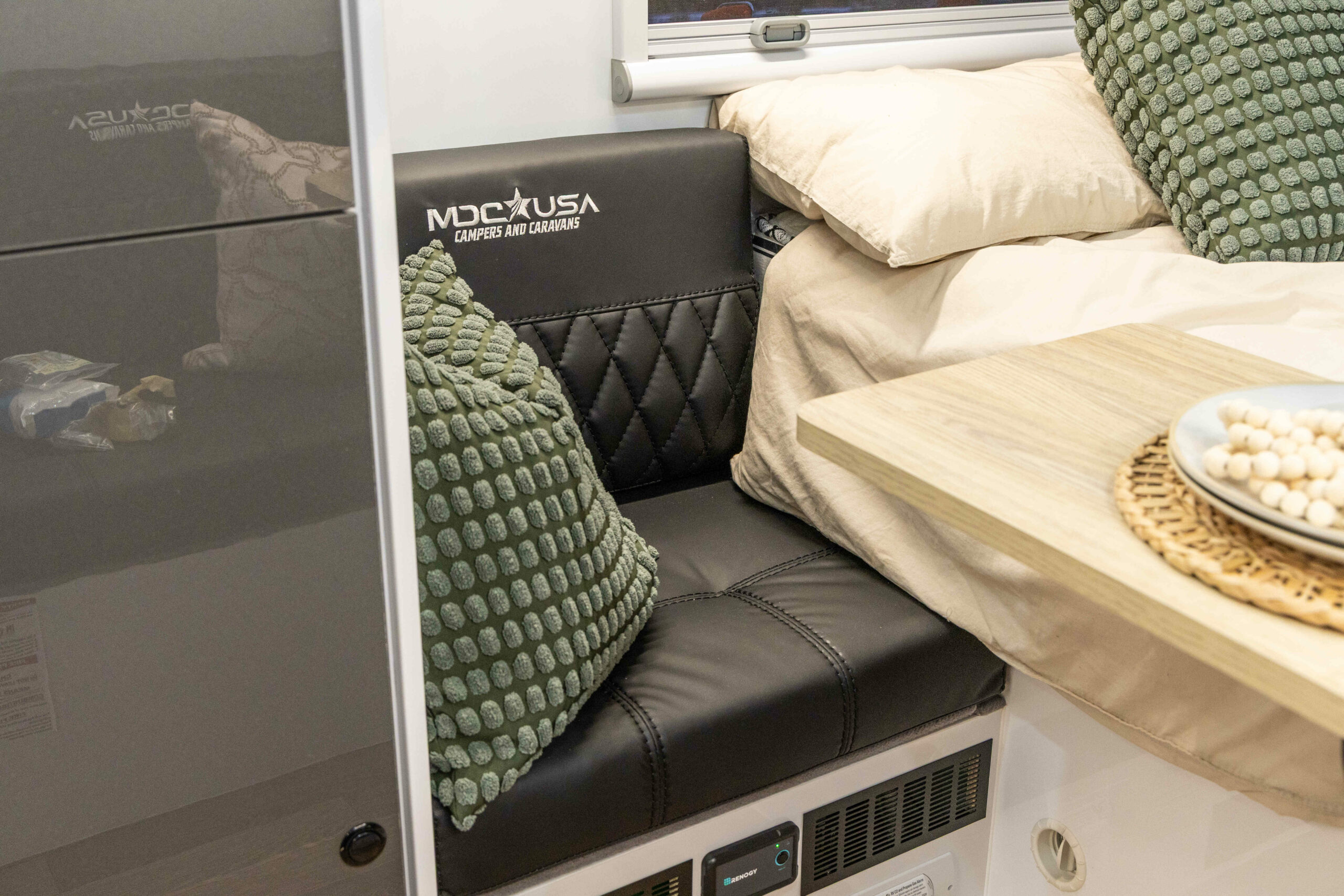 The trailer includes a Truma Aventa Eco 13,500 BTU/h air conditioning system and a ducted Truma VarioHeat 11,500 BTU/h propane furnace to ensure year-round comfort. The Cold Weather Pack features water tank heating pads, a Truma AquaGo Comfort Plus hot water anti-freeze kit, insulated water lines, and self-heating lithium batteries, maintaining functionality in various climates.