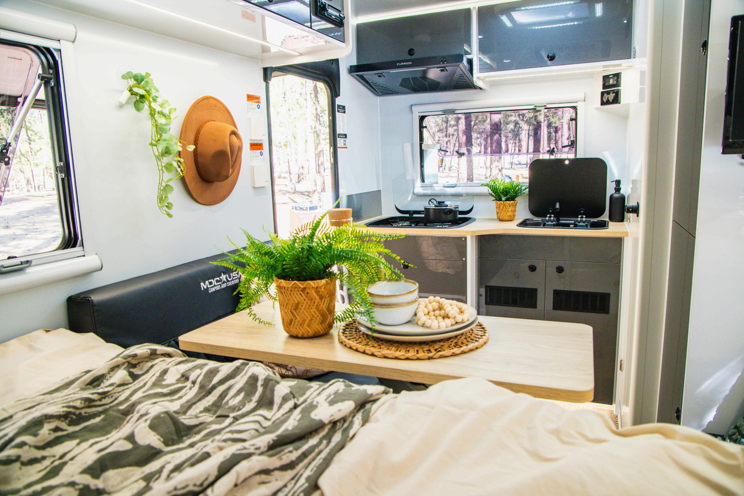 Inside, the trailer accommodates two people with a custom pillow-top Olympic queen-size innerspring mattress. The interior includes a wet bath equipped with a Thetford C400 cassette toilet and a hot and cold plumbed shower. The living area is designed for relative comfort, featuring modern amenities such as a 19-inch LED TV and a stereo system with internal and external speakers.