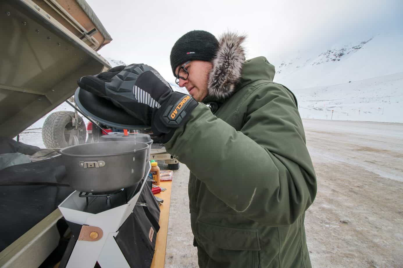 The Chaser platform is now available with a range of cooking options including a “Stand Alone Kitchen”, slide out stove, cutting board, hot water, and storage trays, but we chose to stick with the basics. On the rear passenger quarter panel, a 5-lb propane tank was mounted for use with a stove or propex heater. Since we were regularly encountering freezing temperatures, we opted for the latter, and used a Primus stove for cooking instead. Our second option was a Baltic birch shelf, which can be wedged over the fender to make an excellent table or prep surface. I’ll be honest and say that this design impressed me far more than it should have. Instead of developing some complex and expensive accessory, they cut a piece of wood to size and added two metal tabs to the fender to keep it seated in place. It’s simple, it’s effective, and I love it. Initially we stored this table down the inner wall of the trailer, however, we soon discovered it could lay across the tub in the rear to form a shelf for supplies. This made accessing items on the bottom level through the tailgate much easier, as it prevented the top layer of equipment from collapsing.