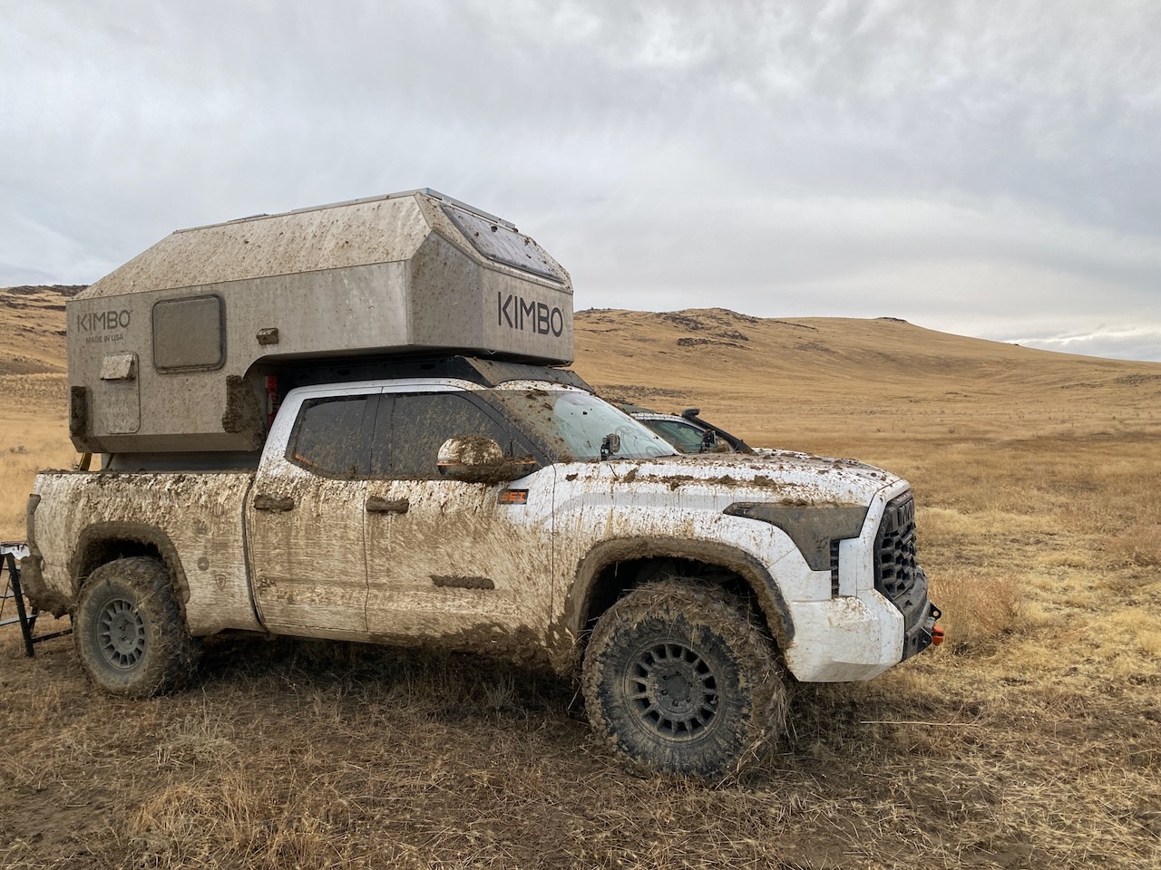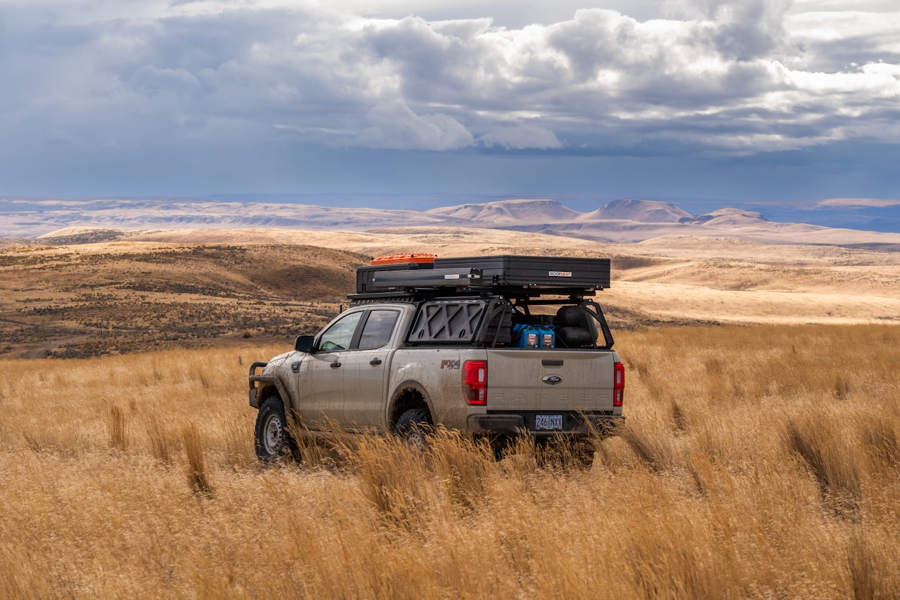 My ride would be a 2022 Ford Ranger XLT in FX4 off-road trim, with a handful of practical off-road performance upgrades, including the Ford Performance Pack tune, Old Man Emu BP51 suspension system, a ComeUp winch-equipped ARB bumper, ARB spots, and, of course, Firestone M/T2 mud-terrain rubber mounted on factory steelies. With a Leitner Designs bed rack and storage system, a Decked drawer, and a Roof Nest tent and awning, the khaki Ranger exuded a very African-safari vibe. True to under-budget form, Micah and Seth shared a ground tent and drove minimally modified pickups—a Ford Ranger Tremor and a Toyota Tacoma. Talon’s Tundra featured the most elaborate habitat among us: a cozy Kimbo camper that, from a distance, looked like a UFO floating across the prairie when underway. Nick’s monster Super Duty Ford, outfitted with a chassis-mount MITS Alloy canopy, was our anchor vehicle, and Josh’s GFC-equipped Jeep Gladiator ran point.