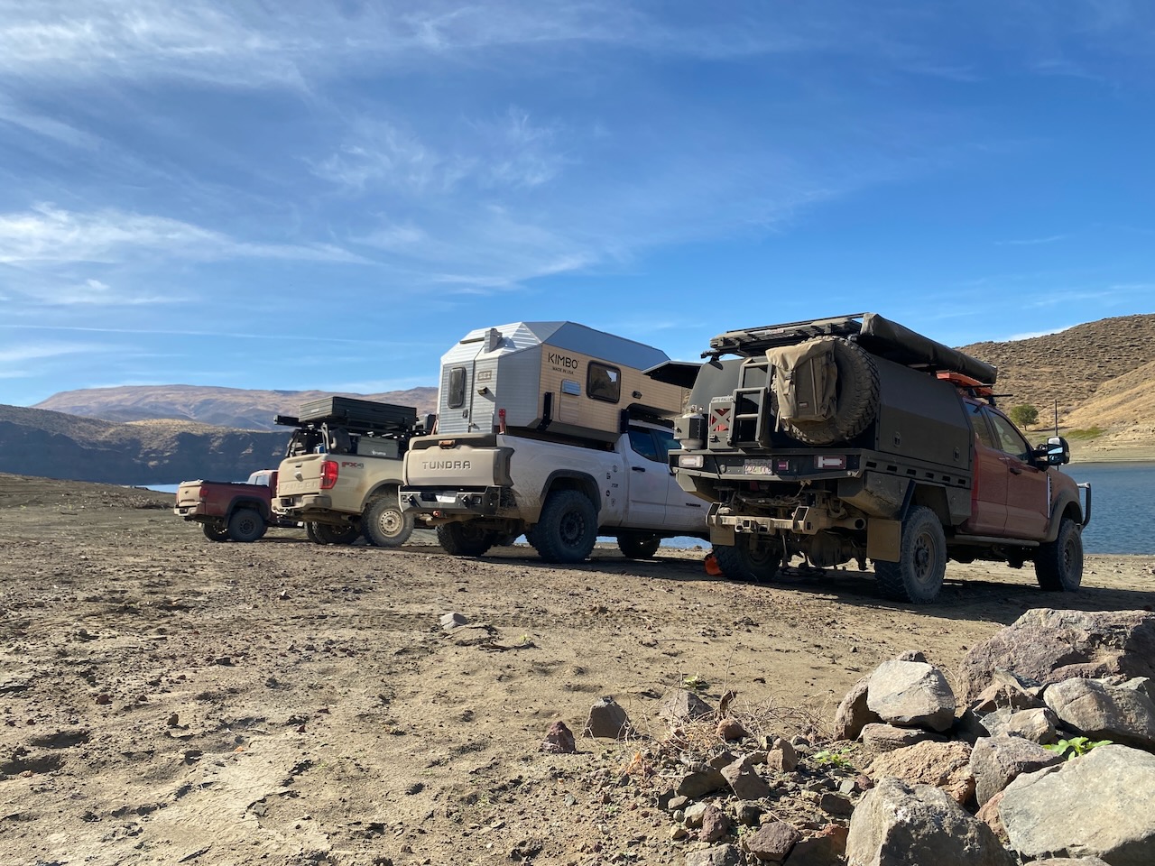 But technical 4×4 trails abound in the Owyhee as well. Sharp anticlines and heavily eroded hillsides define this terrain, and dramatic elevation swings of thousands of feet are common. Many overgrown two-tracks cling precipitously to the crags, and steep climbs in low range brought us to high overlooks where the views stretched seemingly clear to Nevada. We descended to the lake, where Nick’s four-legged friend Arlo chased ball after ball, leaping joyfully into the grainy waters. Much like our first campsite, the second found us posted under towering, crumbling basalt cliffs lit up by an October Super Moon as we munched on Micah’s tacos. But change was in the air—shoulder season conditions in the high desert can be unpredictable.