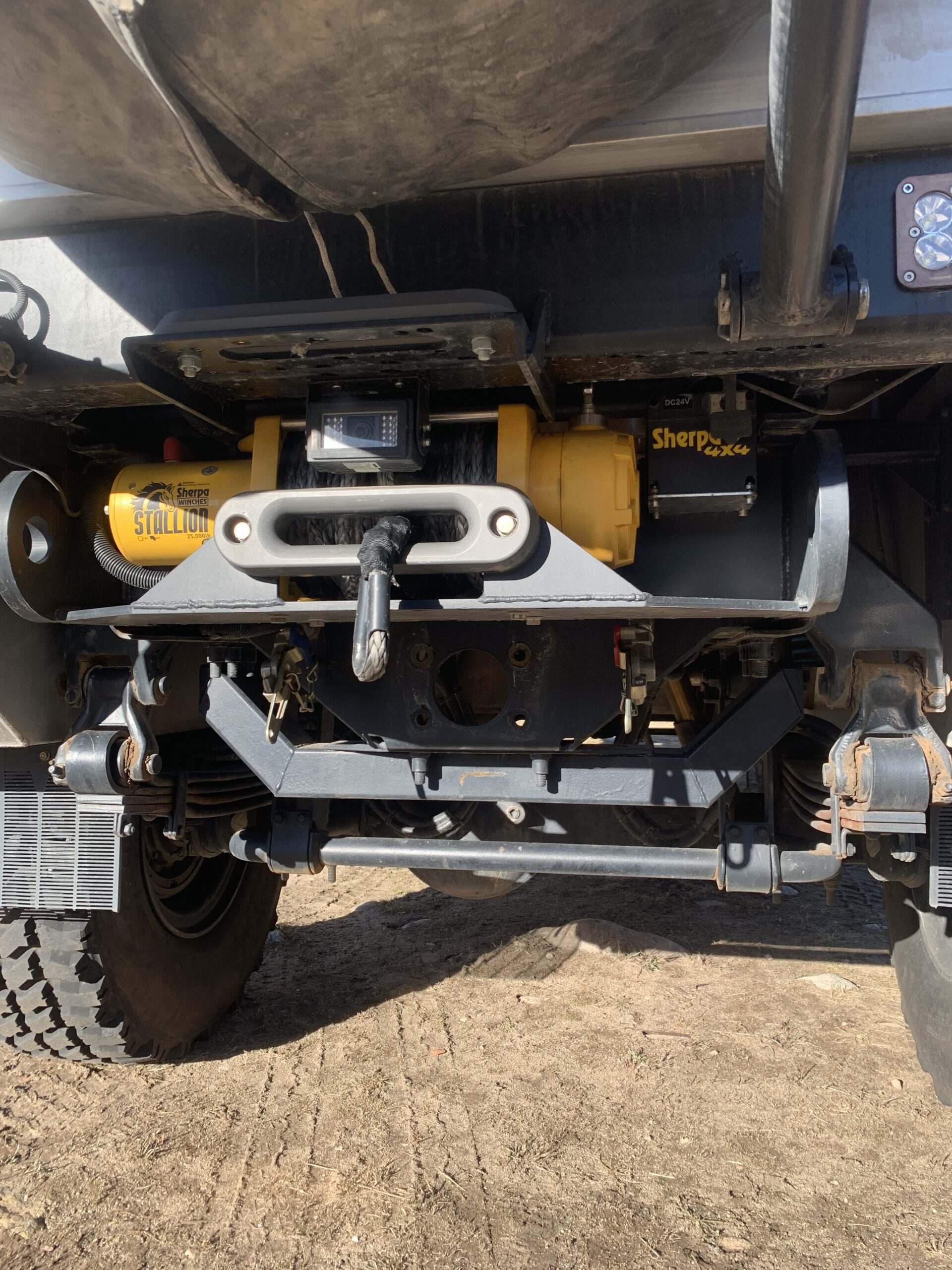 Custom rear winch mount with Sherpa Stallion 25,000-pound winch and synthetic winch line