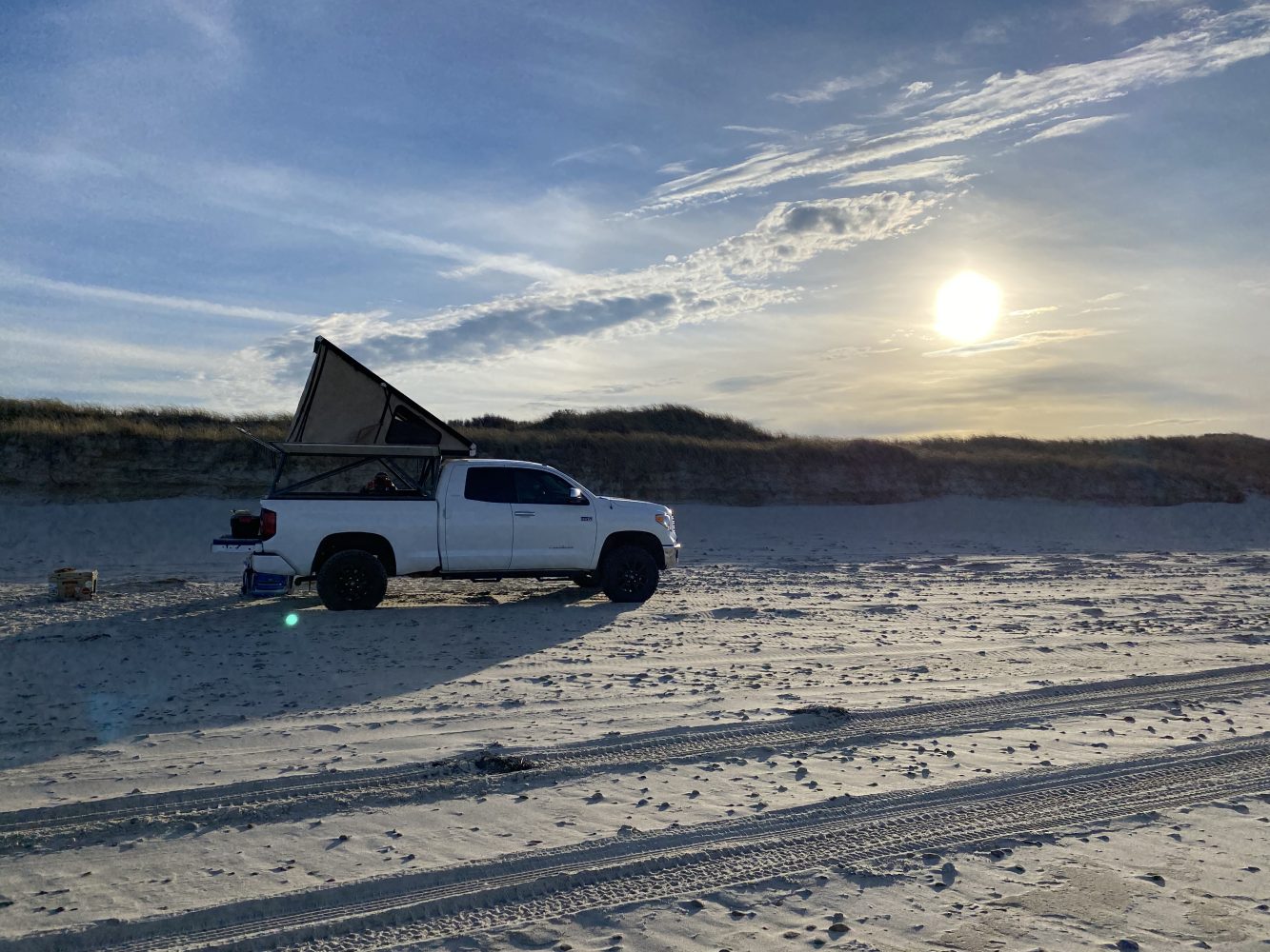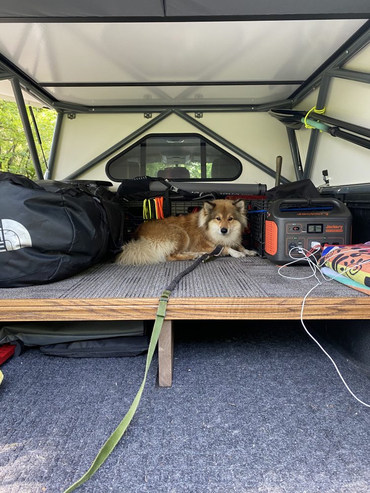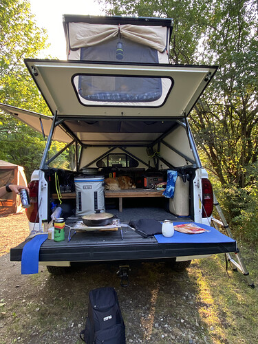 The Go Fast Campers V1 Canopy Camper currently mounted on this Tundra is an incredibly lightweight (roughly 300 pounds) truck bed canopy-meets-overland camper. Its integrated wedge-style rooftop tent opens in seconds to reveal a sleeping platform. Thanks to modular floor panels, occupants can access the tent via the truck bed instead of having to climb a ladder, like with most rooftop tents. This also creates the unique opportunity to use the sleeping platform as a work or cooking surface while standing in the truck bed where you are protected from the weather. This particular Canopy Camper has been outfitted with beef racks, Go Fast’s roof rack system, adding an additional place to secure cargo (see surfboard in header image).