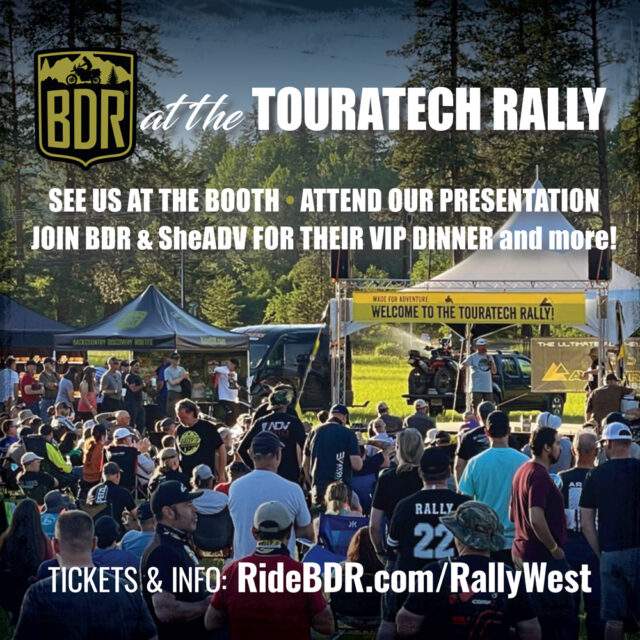 There’s plenty going on at this year’s Touratech Rally West, including a four course dinner catered by Moto Chef with special guests Sterling Noren, Eva Rupert, and Inna Thorn. For more on upcoming route expansions, stop by the Friday night BDR presentation, which will cover the launch of the Southeast BDR, new connector routes, and sneak peeks of future BDR routes in Montana, Texas Hill Country, the Lost Coast, and more.