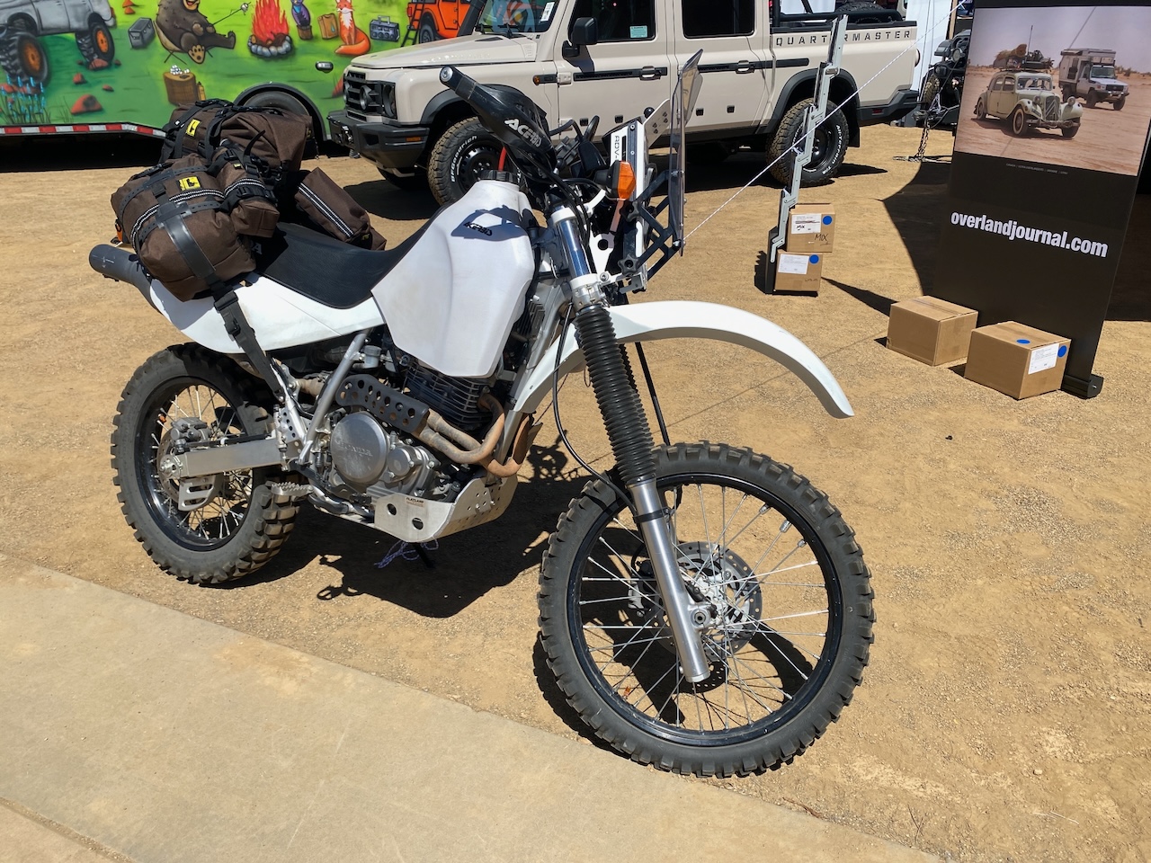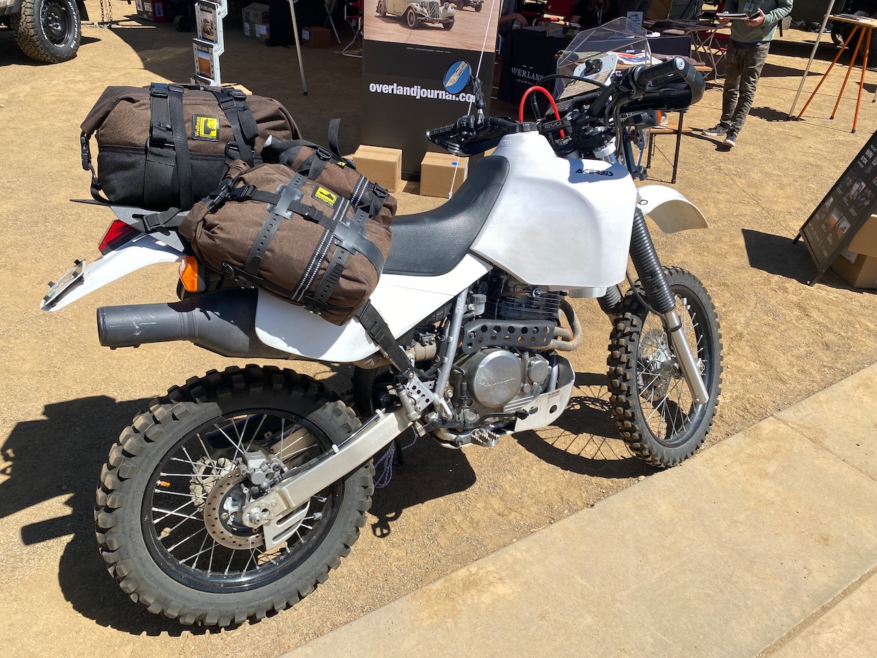 Eric Hougen is the proprietor of Wolfman Luggage. He builds made-to-order moto luggage out of his small shop in California, personally sewing the fabrics by hand. These storage systems are minimalist and over-engineered for a lifetime of hard use on ambitious moto adventures—much like his 2022 Honda XR650. Modified very little from its original configuration, an Acerbis fuel tank and some improvements to lighting, carburetor tuning, and wind management are the only big upgrades; even the suspension and exhaust remain stock and not a sticker in sight. All that simplicity in stark white sets off the cool new colorway for his luggage system. We featured his bike at the Overland Journal/Expedition Portal booth at the Expo, and it was all I could do not to hotwire the thing and ride away into the desert.