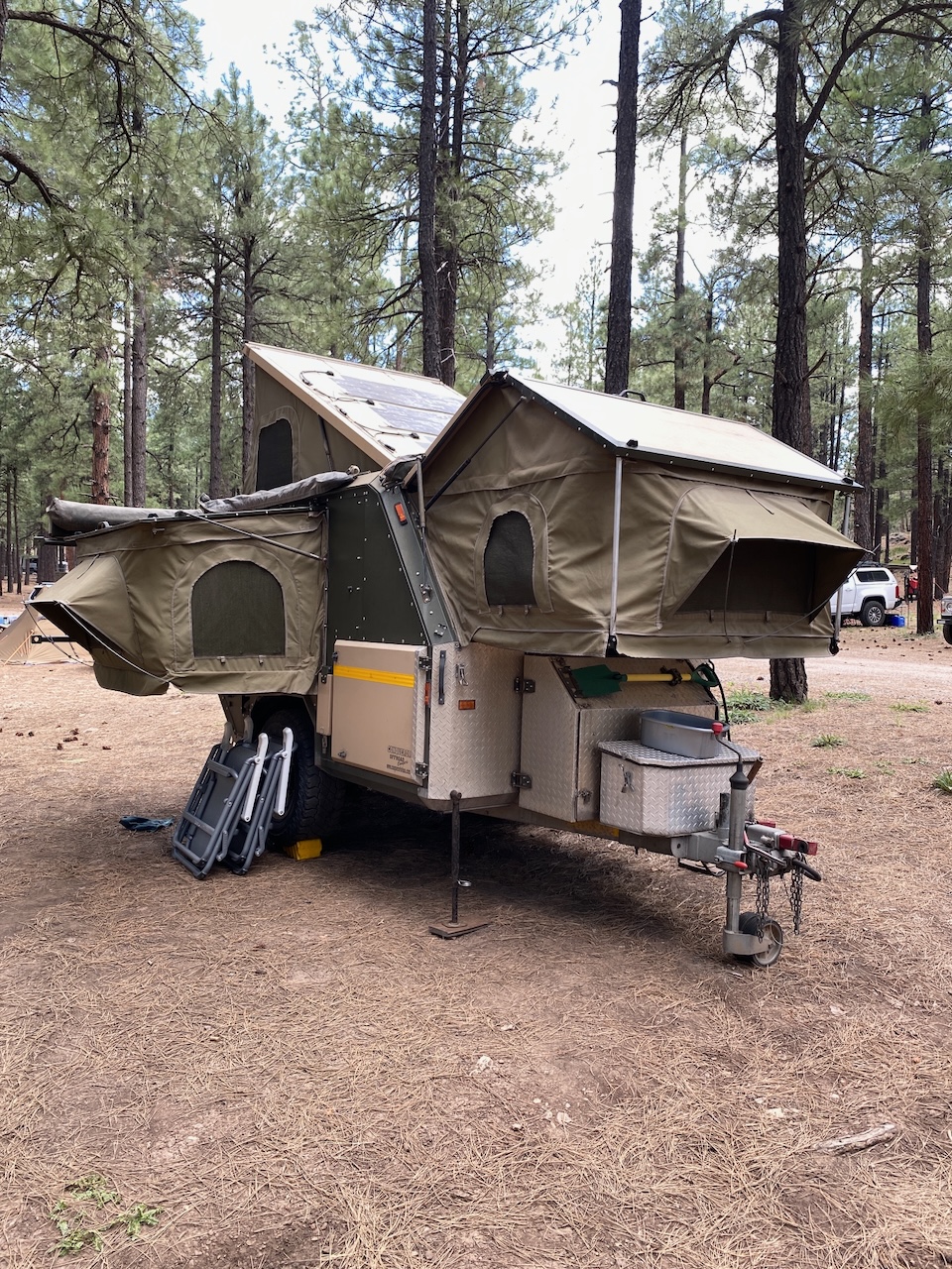 Often, the campgrounds are where you run into some of the more interesting rigs at Overland Expo. This very plain, very original Land Rover Defender 110 300 Tdi was equipped with the brass-ring habitat for Defender owners—an Alu-Cab Icarus pop-top conversion. It is pricy, but it turns the stalwart box-on-wheels into a surprisingly spacious living area without impacting the overall profile of the vehicle. I’ve been scheming to get one installed on my own Defender for a long time.