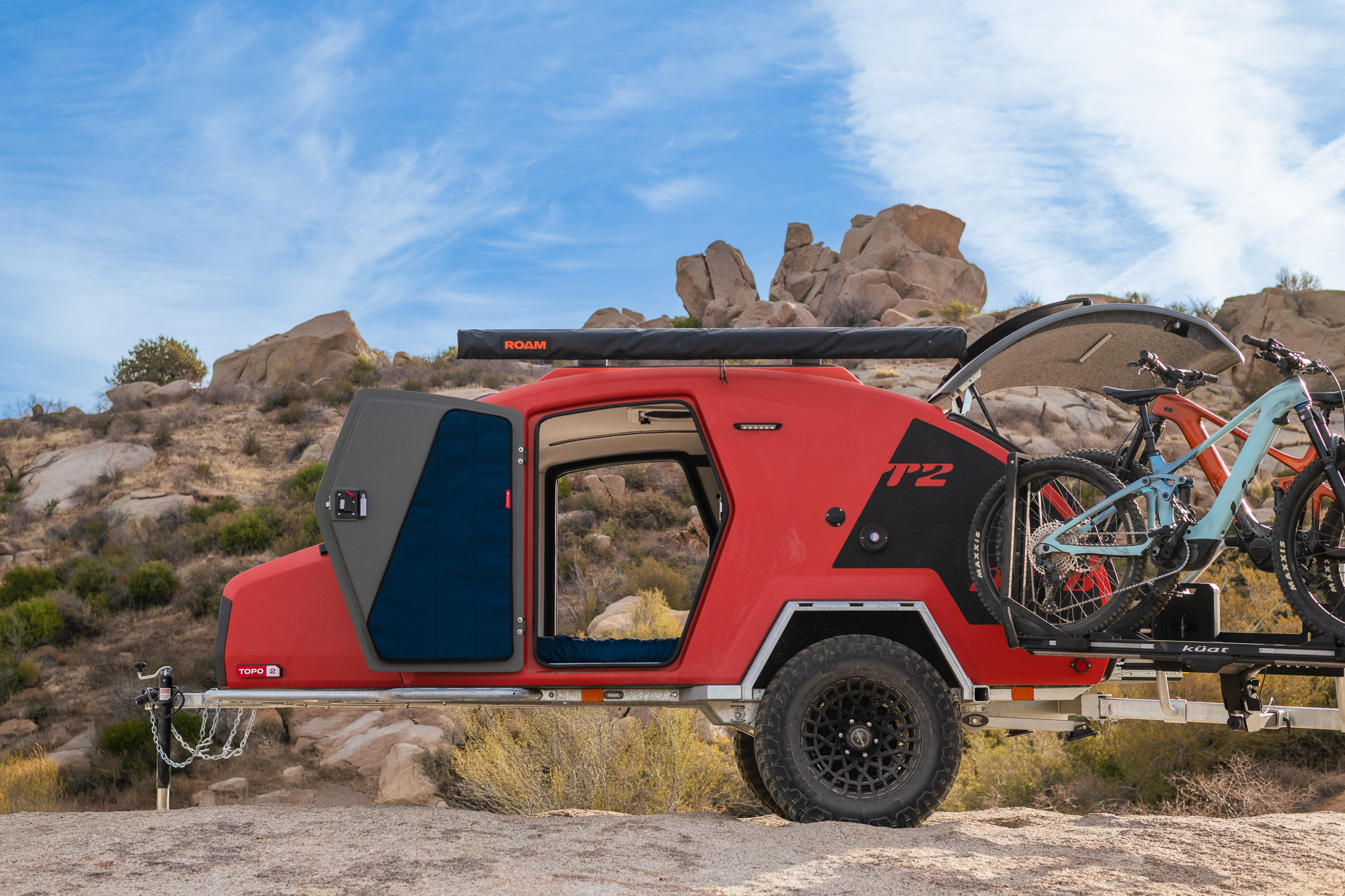 The Topo2 MTB is a high-performance off-road teardrop trailer with a custom-designed Switchback hitch, a swing-away hitch that allows full galley access at the rear of the trailer, even when loaded with two bikes. The trailer includes a bull bar, Rotopax mount, and Küat’s new Piston ION E-bike rack, which can transport any pair of e-bikes up to 80 pounds. Additional features include a 21-gallon water system, lithium batteries, an outdoor shower, and 23 inches of ground clearance.