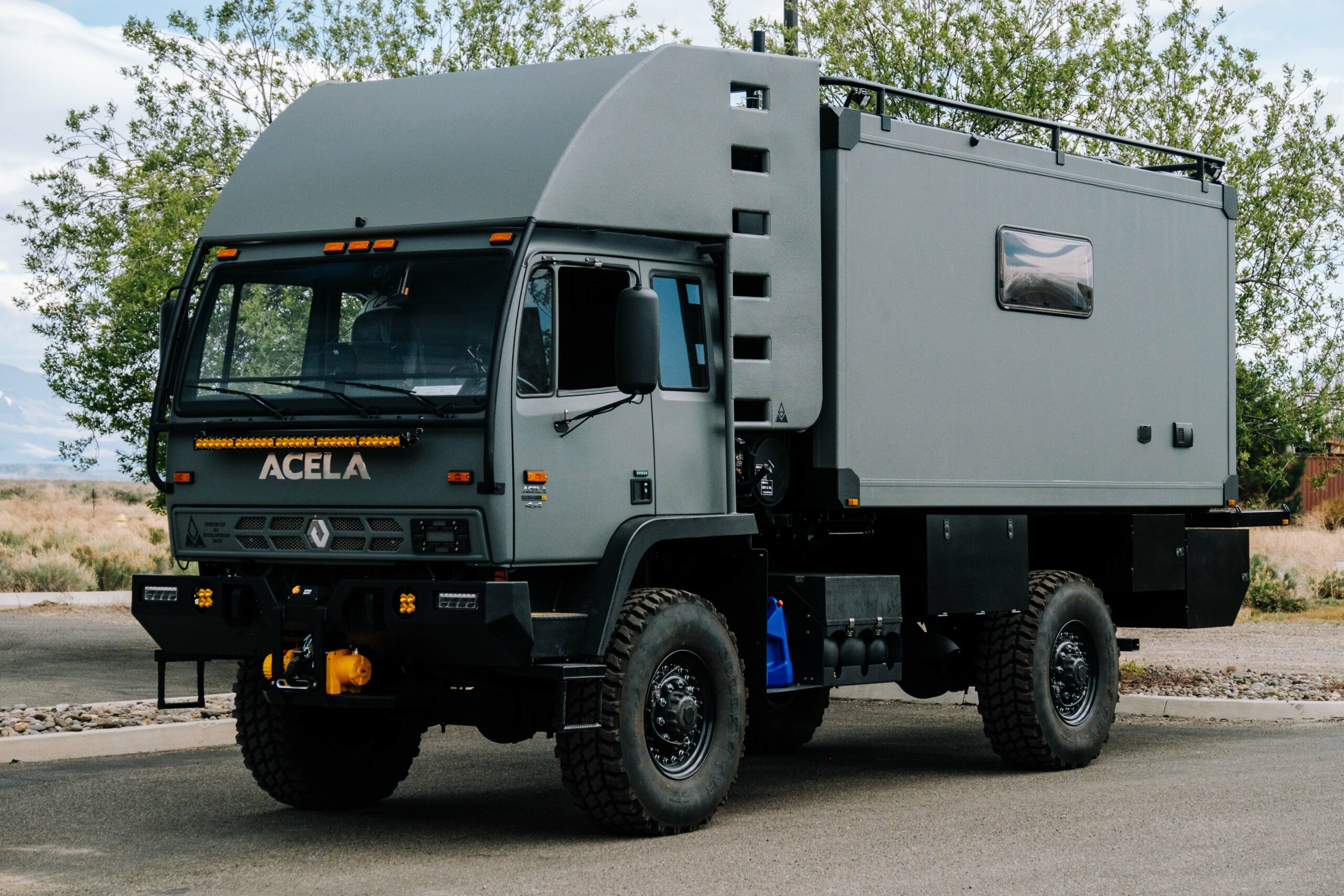 The colossal Predator EXP rides on an Acela-built Monterra GL 4×4 and is powered by a Caterpillar 7.2-liter turbo-diesel I-6 3126 with an Allison 3070 seven-speed automatic transmission and integral transfer case. Its spec list is lengthy and includes a habitat box sleeping two to three adults, a range of 113 gallons of fuel, a custom four-point articulating subframe, locking storage boxes, and a 25,000-pound Australian Sherpa recovery winch. The interior leaves nothing to be desired in the comfort department, featuring an induction cooktop, convection microwave, LED lighting, a Victron rooftop solar system with lithium-ion batteries, and much more.