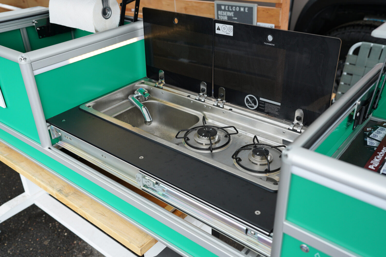 The Pullkitchen is an all-in-one solution that can be installed in your truck, van, SUV, or trailer. It has everything that you need to prepare delicious meals in the backcountry including prep surfaces, a two-burner stove, sink, and food storage. The Quickmount option allows travelers to easily remove the Pullkitchen from their vehicle in as little as three minutes and the whole setup weighs in at 200 pounds. The minimum cargo space required to mount the Pullkitchen is 60 (L) x 21.5 (W) x 17.75 (H) inches.