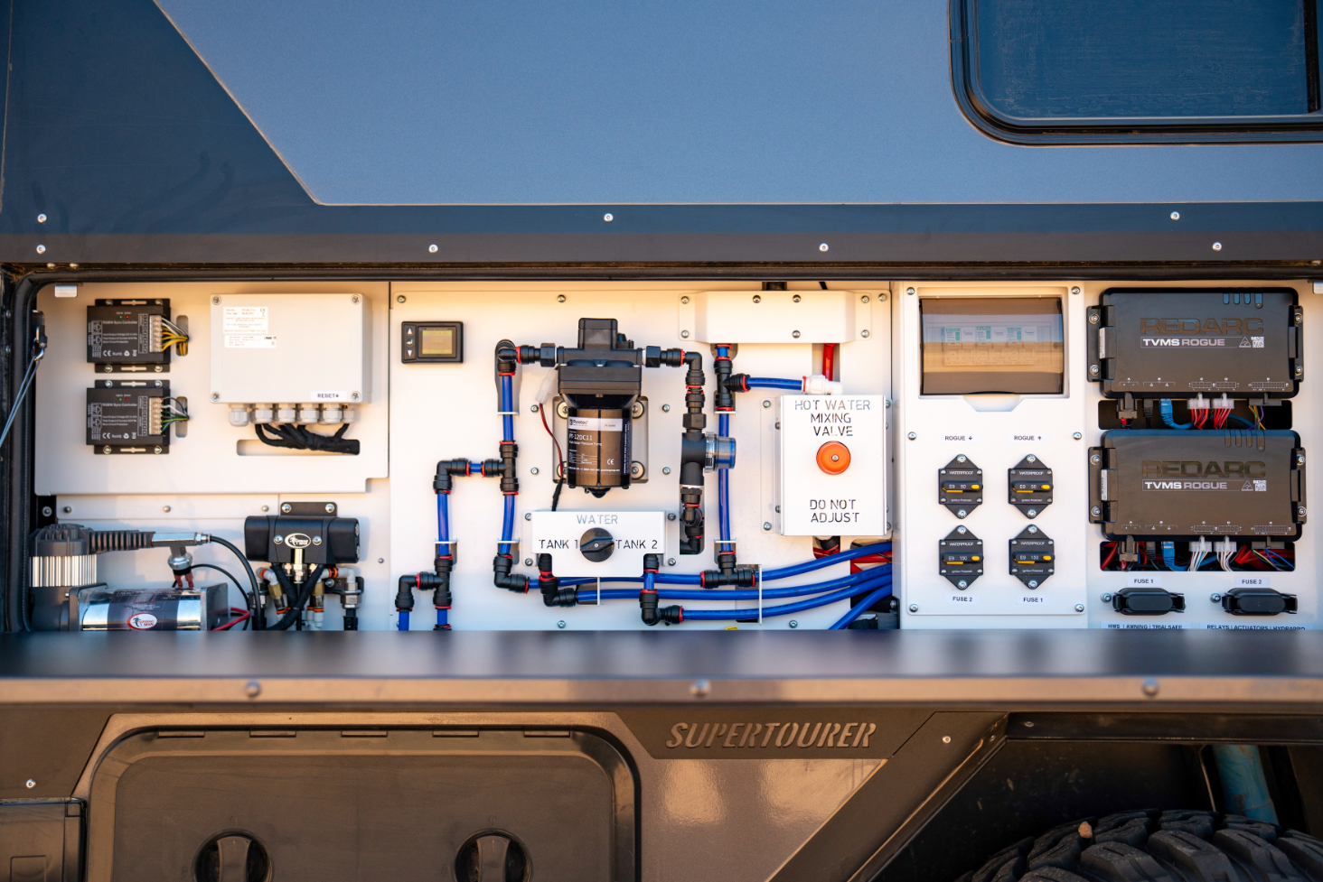 Powering the trailer is a 460 amp-hour lithium battery system fed by the rooftop solar array and a 50-amp charger. A 3,000-watt inverter, multiple 240-volt/110-volt GPOs, and USB-C ports allow comprehensive power access inside and out.
