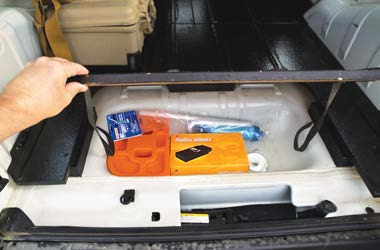 Despite our admiration of the Overland, it was not without complaint or criticism, primarily focused on the 3.8-liter V6 and a 4-speed automatic transmission. The 6-speed manual would have been a better fit and more rewarding to the driver. We also found that all of the roof weight affected the Jeep’s ability to climb steep ledges and waterfalls, the rearward bias and light V6 engine causing dramatic wheel lifts from the front tires. This was easily fixed by removing the items from the roof. To make the project vehicle completely useable, we installed an ExtremeAire compressor, a fuse block and AGM battery, 17-inch AEV Savegre wheels, and a two-meter HAM radio.