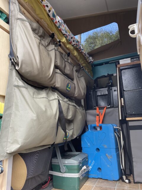 Storage space was abundant, including two under-chair lockers accessible from the exterior side lockers and various interior storage solutions. A locking side door, complete with a portable step, provided easy access, while a privacy curtain divided the cab and rear areas. An external fold-out side table further enhanced the functionality of the space.