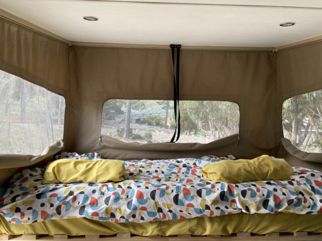 The camper ticked all the boxes: its rear was comprised of a high-quality camper box constructed from composite sandwich panels. The pop-top roof, equipped with gas struts, was easily secured and designed for simple one-person operation. The canvas sides, featuring windows and mosquito mesh, provided comfort and convenience. Internally, the camper hosted a cozy two-seat dining area with a collapsible table, which could be transformed into a single bed. Additionally, there was an above-cab sleeping area for extra accommodation.