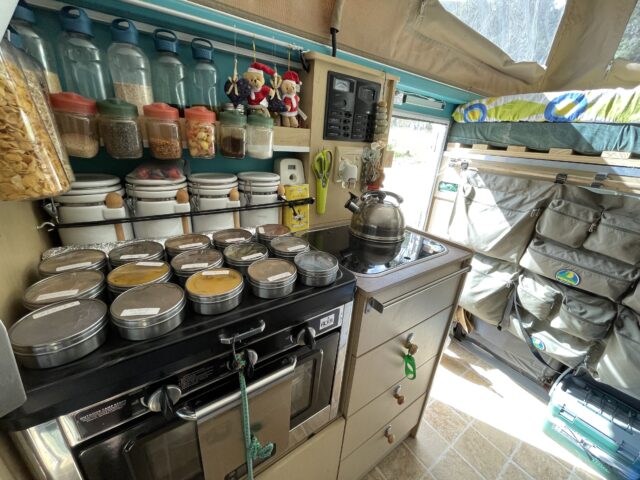 The kitchen area was well-appointed, featuring an Alva 2-ring hob, grill, oven, and sink boasting a glass cover and fold-out hot/cold taps. The area was completed with a food preparation space, drawers, shelves, and a dual fridge/freezer that operated on both 12 and 220-volt—essential equipment for a traveling chef.