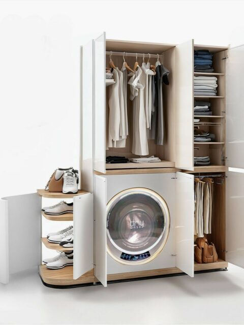 Space optimization continues with the placement of an “intelligent” wardrobe that discreetly conceals a washer-dryer combo. This contributes to a layout that flows from lounge to kitchen without compartmentalizing points.