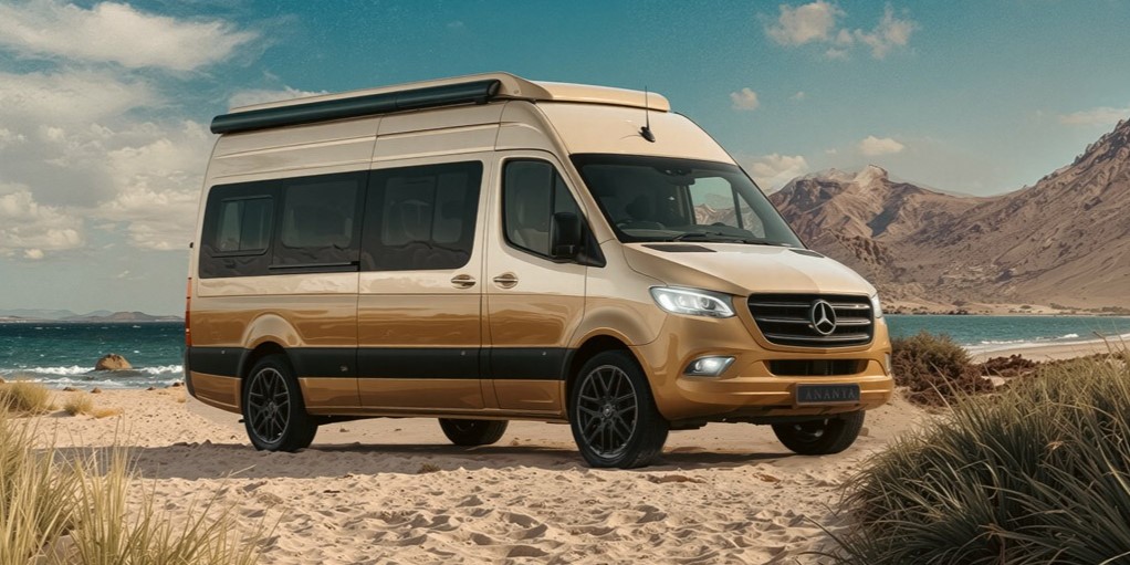 The foundation of the Ananya is a Mercedes-Benz Sprinter 419 CDI 4×4 long-wheelbase chassis, offering both rugged capability and executive presence. At nearly 7 meters in length and standing at an impressive height, the vehicle maintains a familiar van footprint while exuding scaled-up luxury in shades of gold and ivory.