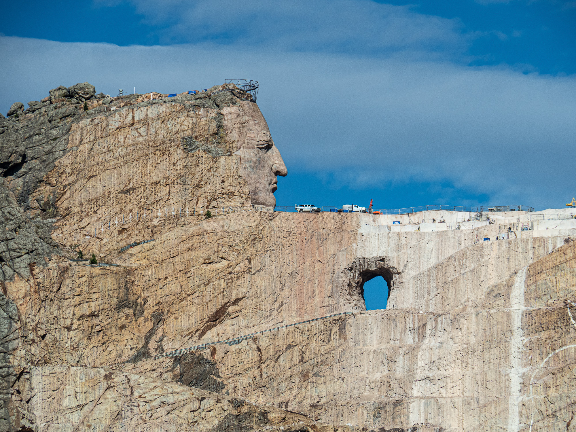 Now, almost three-quarters of a century later, Crazy Horse is still under construction with no signs of completion. Korczak Ziolkowski died in 1982. His wife, Ruth, took over and opted to sculpt Crazy Horse’s face first, hoping to draw tourism. Korczak envisioned the hero riding atop his steed, but a cartoon-like outline on the rock of the animal acts as a placeholder in the meantime. Crazy Horse’s face—27 feet higher than Rushmore’s presidents—was completed in 1988.