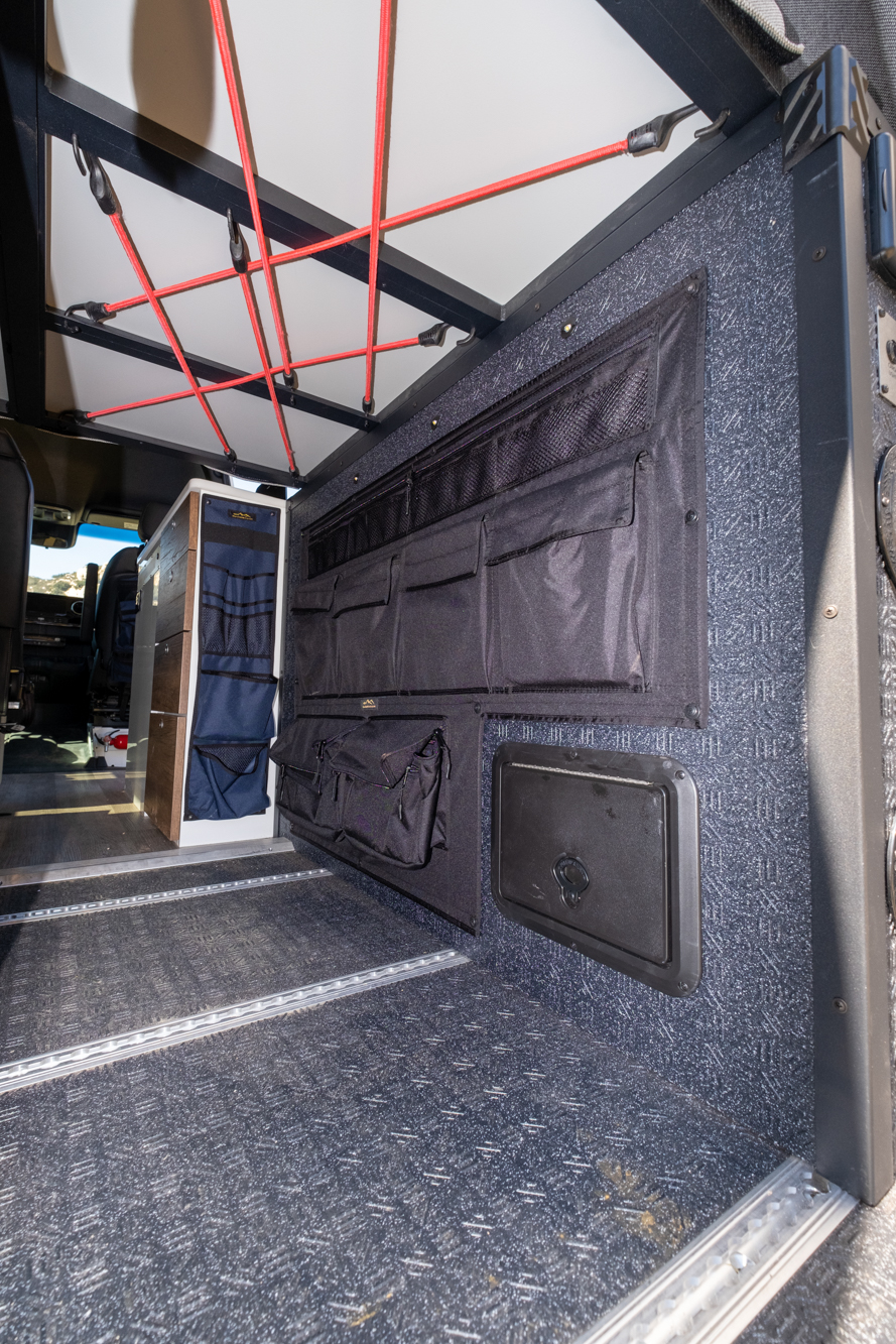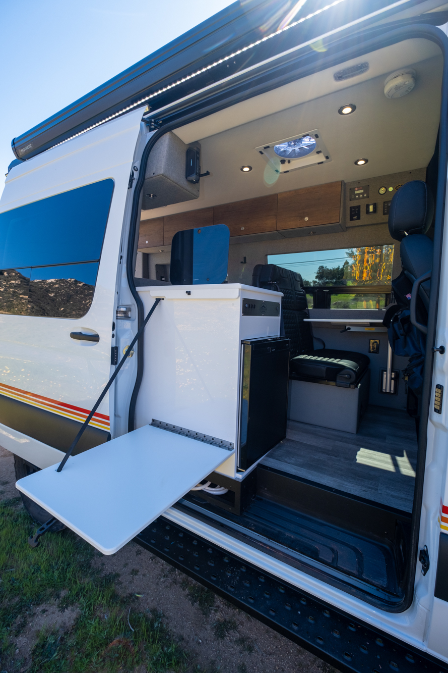One of the biggest benefits to the Storyteller is the van’s flexibility in layout. It is designed to be the do-it-all adventuremobile, and thus it accommodates darn near any activity you can think of for you and up to three of your friends. One of the key components to making this happen is the 150-cubic-foot Gear Hauler. This ruggedized garage features “moon-boot flooring and walls” with aircraft track tie-downs for securing cargo of any kind. You can load up climbing equipment, skis, snowboards, backpacks, or mountain bikes. Toss in camp gear, duffel bags, or storage boxes, or slide surfboards through the passthrough into the kitchen area if needed. The Dreamweaver bed can even be folded up and out of the way for tall cargo like a dirt bike or even a paraglider. There’s under-bed lighting for visibility at night, and a rinse station to clean yourself and your gear off at the end of the day.
