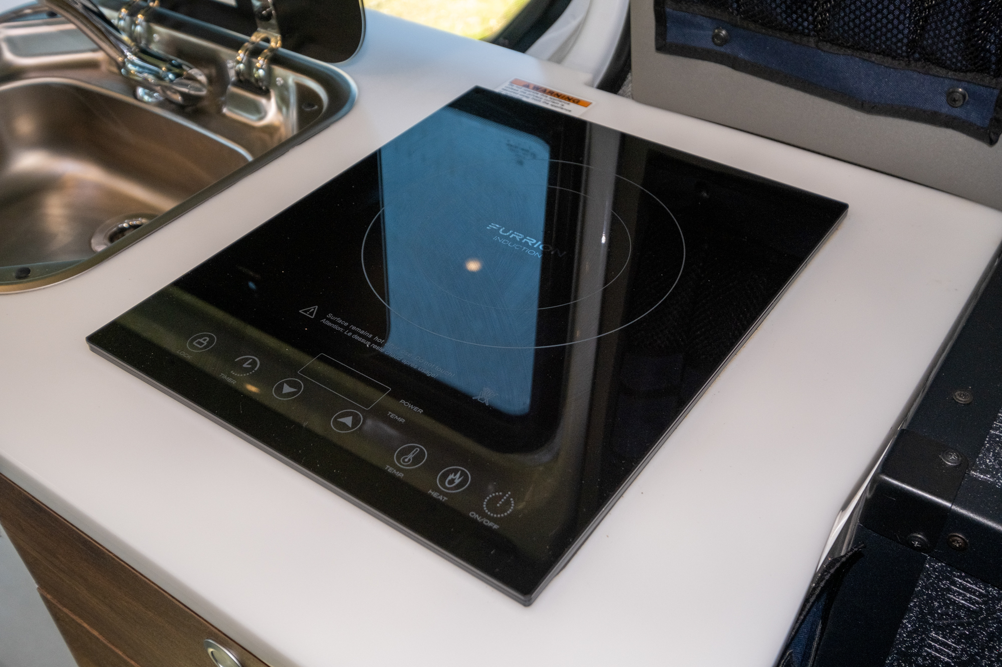 Across from the lounge, you’ll find the kitchen, which has been carefully laid out with an induction cooktop, microwave, and Dometic sink. There’s also a massive fridge for all of your perishables and drinks, and I love that it’s upright instead of the cooler style that we usually see in four-wheel drives. While there is not a load of counter space with the sink open, dropping the Dometic sink’s glass top offers additional prep space for cutting, mixing, and cleaning. There’s not an abundance of storage space, but it’s enough to get by. If I purchased this van, I would remove the microwave above the counter for non-refrigerated food, which would make a huge difference in food storage and solve the storage space issue in the kitchen entirely.