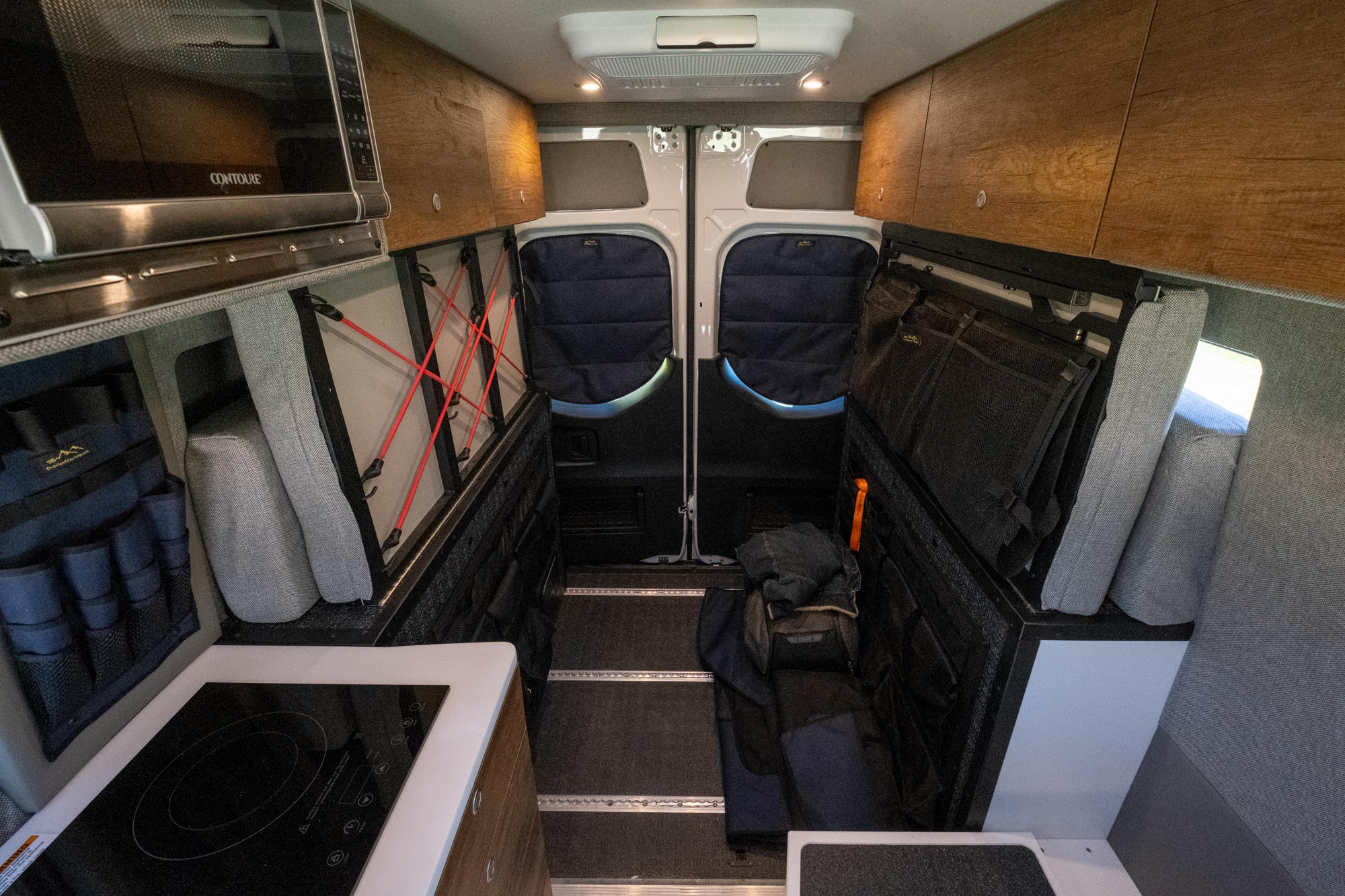 The execution of this cargo space was refreshing, to say the least, especially since most RVs lack a garage section entirely, and those who do have it often forget key details like leaving enough room beneath the bed for mountain bikes. The only downside to the Storyteller garage is that it’s not as wide as some other brands because the water tanks and electronics are stored along the outer walls. While this does take up room, it’s a compromise I will gladly take for the tradeoff of not worrying about my tanks freezing in cold weather or having them hanging off the bottom of the van.