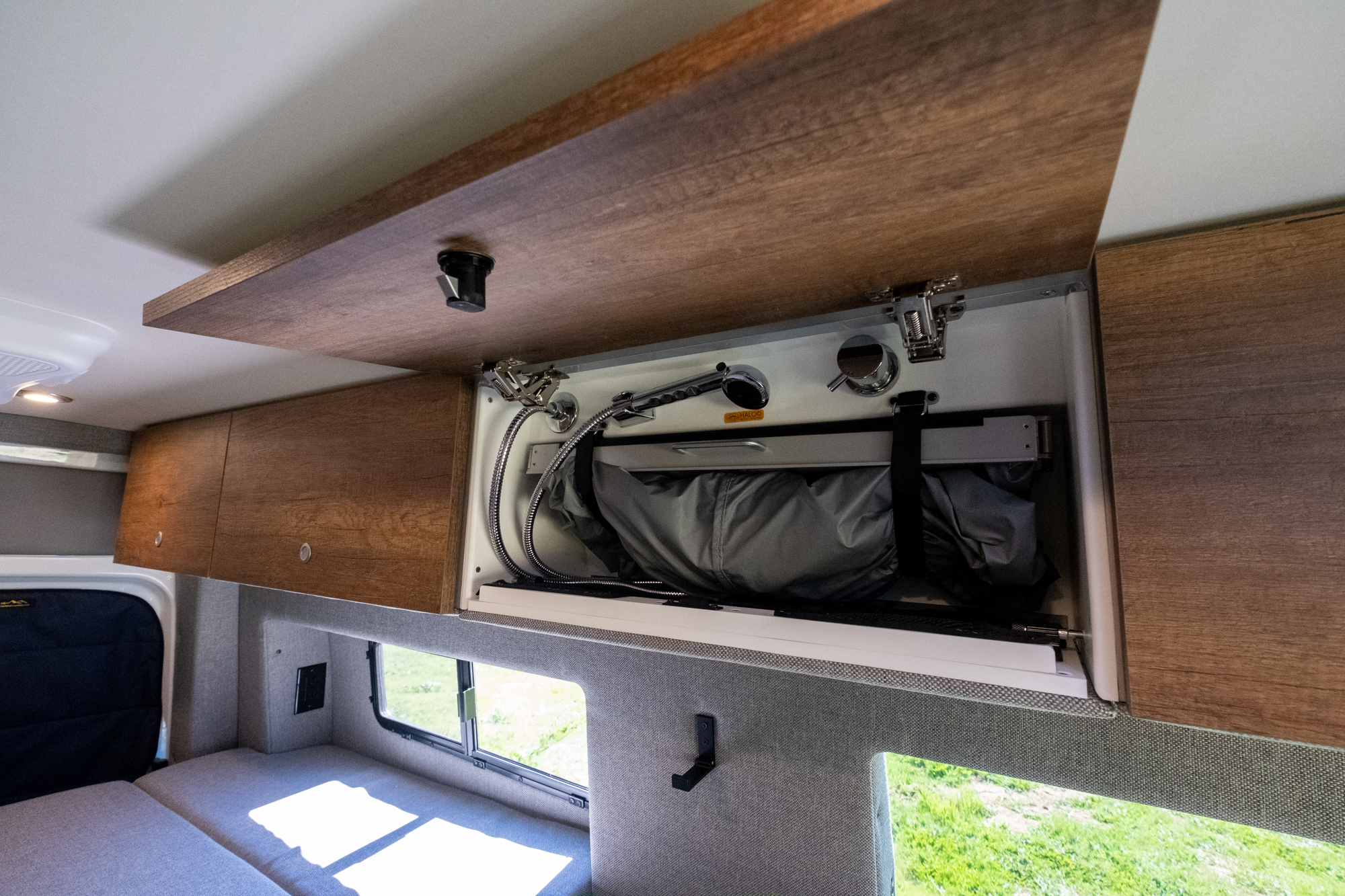 For full-timers, finding organized storage overall can be an issue. The van is catered more toward taking shorter trips instead of heading out full-time on the road. This isn’t to say you can’t live in one, though, just that you’d need to make some compromises or changes if that is your plan, and here’s why. Excluding the Garage, the bulk of the Mode’s storage is contained within six overhead cabinets. Four of these are located over the rear bed and are ideal for providing the driver and passenger a week to two weeks of clothes depending on how often you change. Another overhead bin is consumed by the Halo shower, which can be removed for additional storage if desired. Finally, a small overhead cabinet is located just forward of that. The remaining storage is found in three kitchen drawers which must fit all of your cutlery, utensils, plates, bowls, pots, pans, and non-refrigerated food. I can tell you that once we loaded the normal supplies from our own van, we found things were very tight, and we had to store our pans under the bed, leave the pot at home, and store our bag of tortilla chips in the microwave.