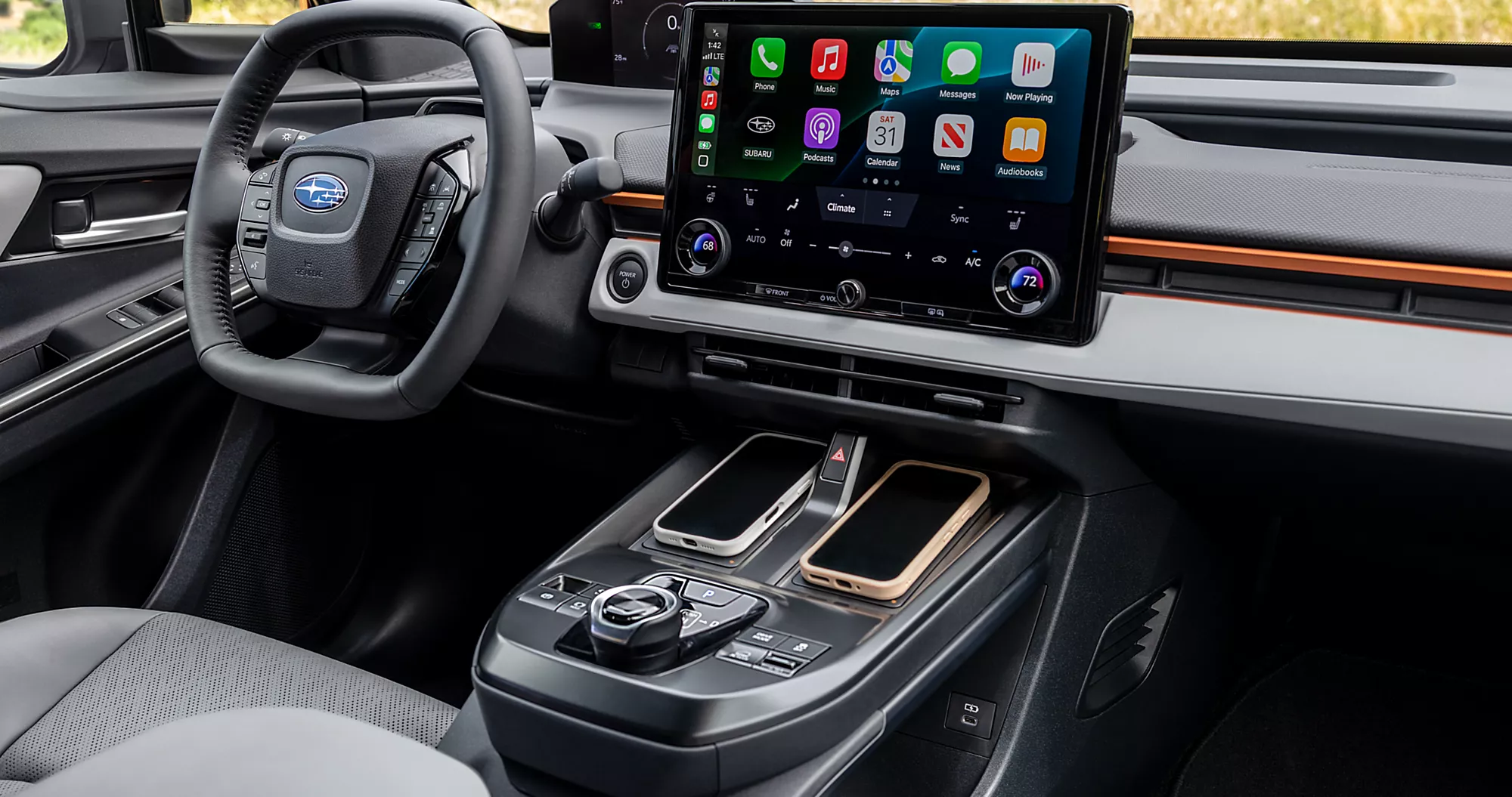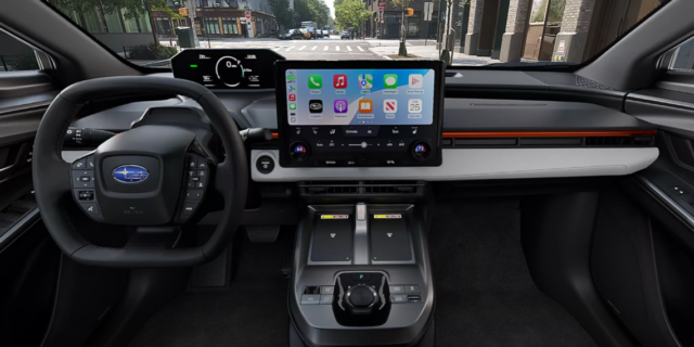 Inside, Subaru describes the cabin as airy and comfortable, with distinctive orange accent trim and an instrument panel defined by sharp horizontal lines. The fastback interior layout seats five passengers across two rows. Standard technology fixtures include a 14-inch touchscreen multimedia system, dual wireless device chargers, wireless Apple CarPlay and Android Auto, and available Harman Kardon premium audio. An optional panoramic glass roof with power sunshade contributes to the cabin’s open feel.