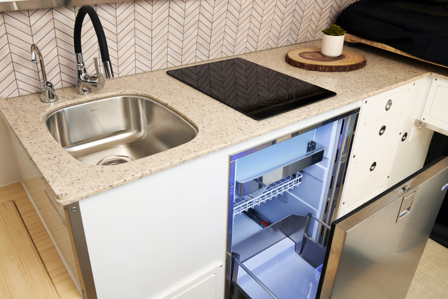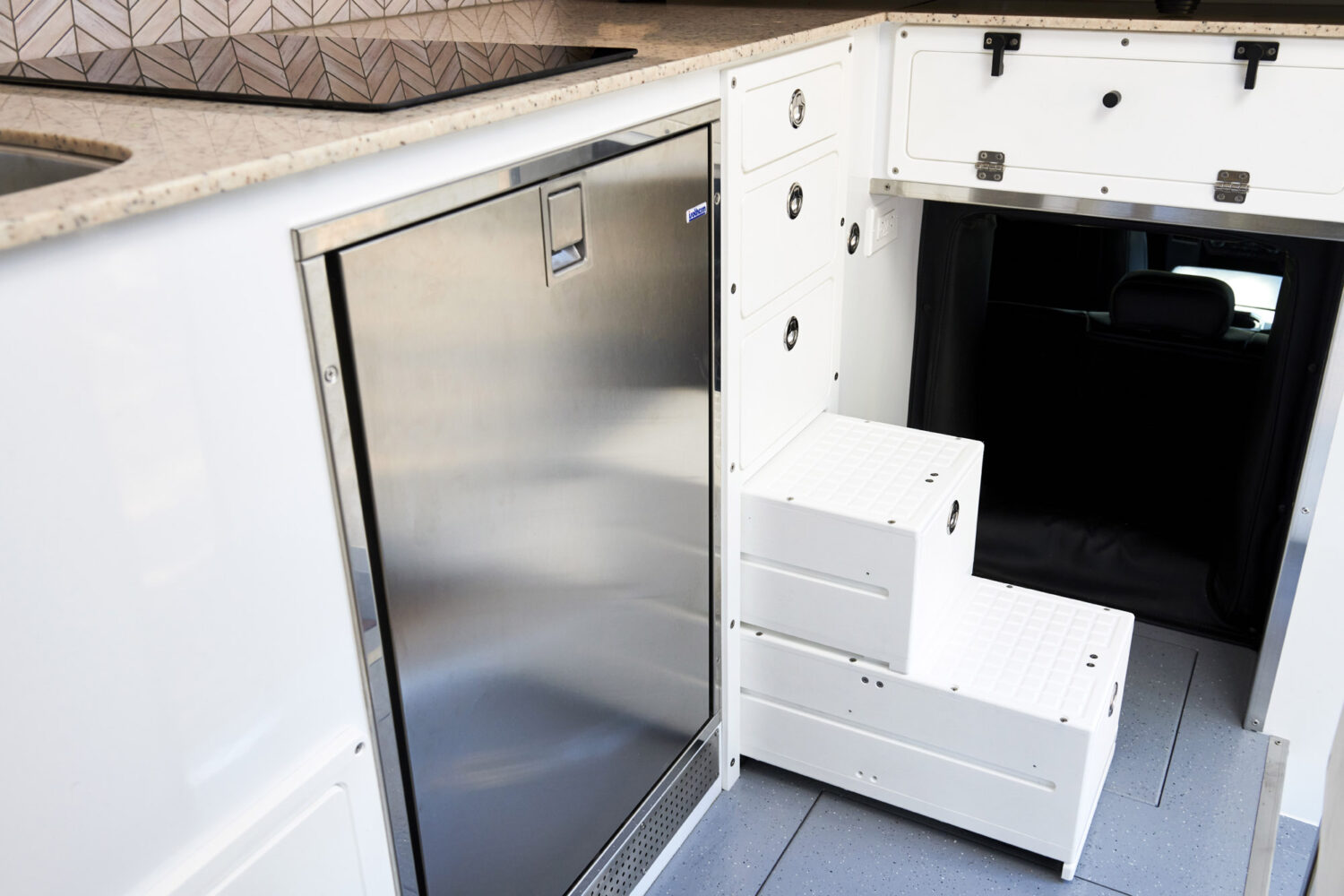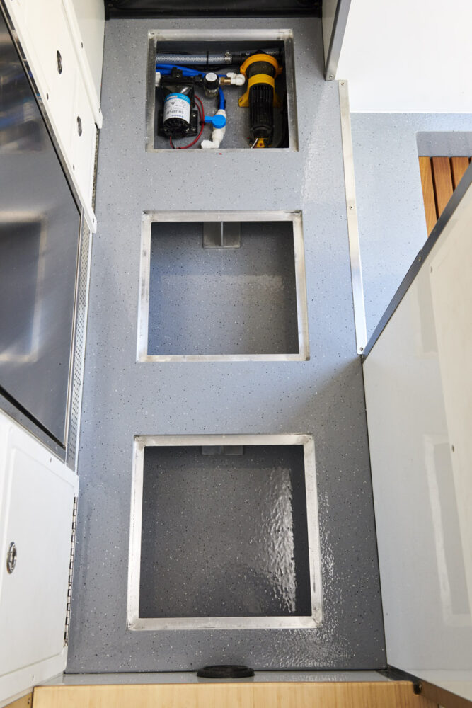 Raised Floor and Stairs with Storage – A raised floor provides additional storage space as well as an easily accessible location for plumbing components that can be accessed from within the habitat. And instead of a conventional ladder, storage drawers that double as stairs provide access to the cab-over sleeping space. This design provides the function of a ladder without taking up dedicated habitat space.