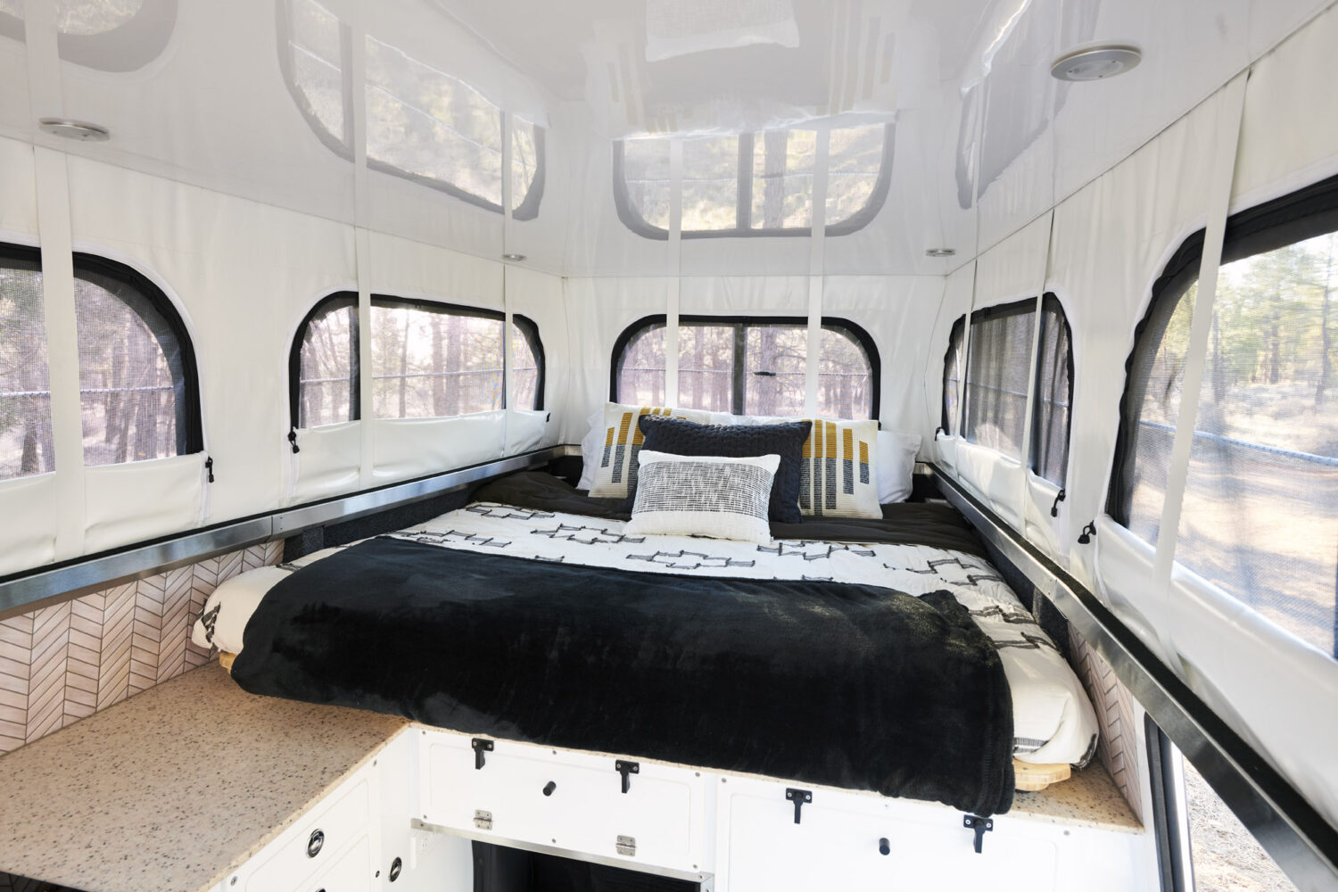 360 Loft – The cab-over portion of the Terranova creates a comfortable lofted sleeping or relaxing space when the vehicle’s pop-top is raised. Folks as tall as 6 feet, 5 inches will be able to comfortably sit in the loft with ample headroom. A wall-to-wall queen-sized mattress provides space to sleep, and thanks to a “clever flip-down feature with countertop bumpers” allows occupants to sleep lengthwise, avoiding the need to climb over one another to get down from the loft in the middle of the night. Power connections, reading lights, and small gear cubbies round out the functionality of this sleeping space.