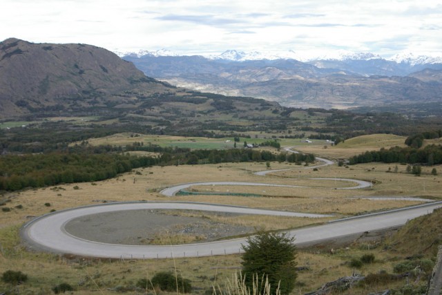 The road continued north east of Lago General Carrera and then eventually slowly climbing steeply up emerging high up above the lake – looking across the still waters at a distance we could see the road we had traversed the previous day hewn out of the rock clinging to the edge of the mountain towering above it. Onwards we drove via Puerto Tranquilo eventually arriving at the turn off into Villa Cerro Costillo a typical pioneer settlement of cement block houses with corrugated iron roofs, plus a few scattered Chilote shingle styled houses, almost dusk but we decided to move on. A few kilometres out of the village we found a campsite on a farm at the foothills of the snow-capped Andes – set up camp – bitterly cold. Our host even offered to put us up in his casa (house), most grateful but graciously declined. We took out all of our blankets and duvets and were snug like bugs in the rooftop tent – slept like logs only to be woken early by the loud crowing of a cockerel. We breakfasted on tea, cereal and fruit surrounded by the farmyard gang. Packed up and vamoosed out of there onto a new concrete paved highway, immediately a run up a steep incline, the road hairpin after hairpin zigzagging its way back into the mountains until we reached the snow line hardly visible since it had last snowed a week previously – ice still visible in the low-lying areas along the gullies and crevices at the edge of the road – cold enough to make an African shiver. Reaching the summit, we called a short halt – Teatime. It breaks the journey but it also gives us the opportunity to indulge a little on tea and decadent pastries or empanadas (pies). No wonder we have put on weight!!!!