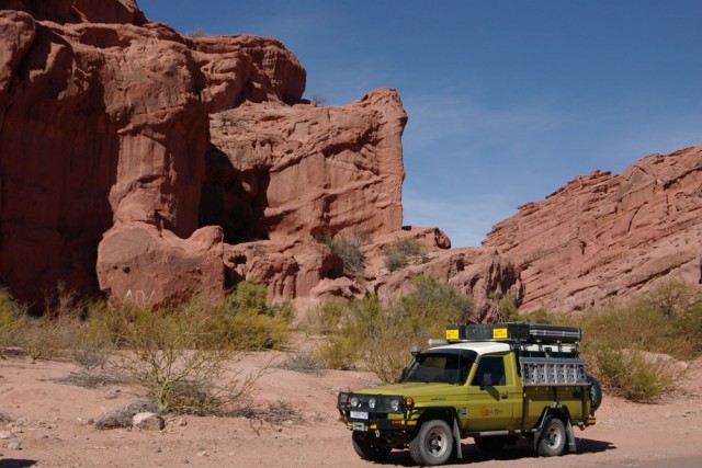 At Pucon it was time for the Land Cruiser’s oil change meticulously done every 5,000 kms. The 4.2 Lt. – 1HZ Diesel has a large sump taking 9 litres of oil. I supply the filter, have stacks on hand. The lube service completed so onwards we rolled via Cararrehue in the direction of the Chilean/Argentinean border ever climbing into the Andes – autumn, trees in their golden splendid Fall colors shedding leaves all around. Halfway up the Pass having crossed a fast flowing river our first stop, the Chilean Aduana. Most helpful, inquisitive and complimentary about the Cruiser – “muy buen”. Off we set up to the top of the Pass and here on the verge of the road only the base of huge Volcan Lanin visible in dense hanging fog. Down the other side through Monkey Puzzle (Aucaria) Forest and to a newly constructed Argentinian Border Post. The “Carnet de Passage” really speeds up our thoroughfare and before long we were descending into the valley towards a tiny village Junin de Los Andes. Mist and drizzle during the exceptionally cold night. Heavy frost blanketed the ground in the morning, however a glorious sunny day. We decided to return up the Pass, a bold decision but worth it. Lanin, snowcapped, stood out above the Monkey Puzzle Trees and landscape in all its splendor, a picturesque scene to behold. Virtually freewheeling back into the valley we pulled off and parked next to an ice cold rushing river, had lunch, gave Tubby a wash, hands frozen but the result was a shining bright Toyota. In my mind there is no need to travel like a grub guts just to look macho and prove that you are on a Safari. Whenever I find it necessary and water is available I have a bucket and chamois on board and the vehicle is washed. Don’t be crazy!!!! Not everyday but once every 3-4 weeks suffices.