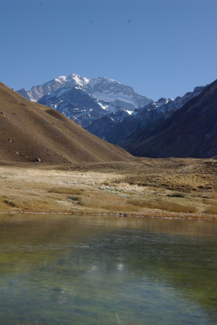 Once we had digested the scenery which had unfolded in front of us we set forth again and entered this setting of such magnitude. Eventually reaching the valley floor almost level with the river running through it, here below we felt as if we were in miniature with our surroundings – now one could imagine what it was like being tiny Lilliputians – ha, ha! Eventually we were driving along uphill with a river not only parallel but remaining level with it, the river rising to its source the road climbing to arrive at the source. We ascended the hill until we reached the turn off to Parque Nacional Aconcagua at an altitude of 3,200m – drove in and parked at the Park office then walked almost 4 kms towards the base of this huge mountain. When we set eyes on it, it was not as grandiose as we had expected – Volcan Lanin was more impressive and we put it down to the fact that Lanin could be seen from its base upwards and Aconcagua surrounded by so many other high peaks only minutely towering up above them on this clear sunny day. It was somewhat disappointing viewed from the altitude at which we were standing looking up at it not being able to see this peak from its base up but engulfed by its surroundings – the Andes. We spent some time in the foothills of Aconcagua the temperature zero degrees, fortunately no wind and sunny, had lunch retraced our steps and returned to our cabana.