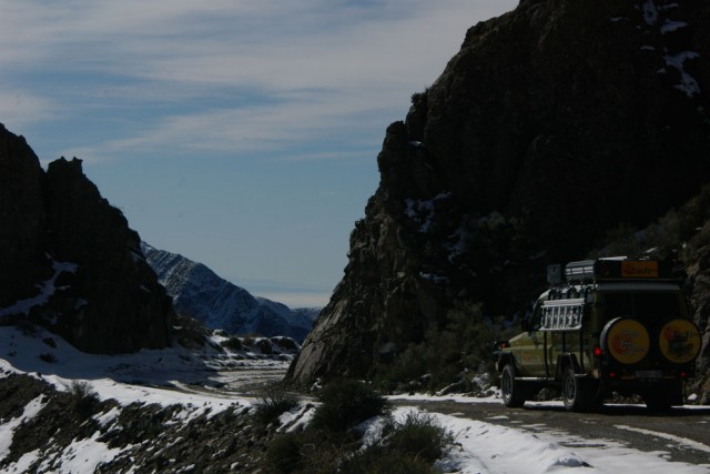 Almost immediately we were descending the stunning narrow Villavicencia Pass, single track, no barriers only a minute mound of a mixture of soil and rock blanketed by snow at the edge of steep precipices disappearing into the abyss below. The road wormed its way clinging to the mountain as it disappeared out of sight, hairpin bend after hairpin bend – an unbelievable 800, yes! eight hundred, switchbacks in all. The Cruiser tracked two ruts in deep snow and ice left by a vehicle, the wheels fitted with chains, having traversed this route the day before, the indentations clearly visible under the frozen ice in these grooves. Slowly we edged our way along the ice snapping, crackling and breaking under the wheels. In second gear the 4.2 diesel with all its tremendous torque controlling the descent on this spectacular route – time was of no essence, our safety a priority. It seemed an eternity of negotiating sharp bends, declines and the occasional incline until we dropped below the snow line and the going was much easier and more relaxing on a dirt track continuing to wend its way down, the total descent a distance of 50 kms and four hours duration. Reaching terra firma, nestling in the valley, a super restaurant – this time the speciality of the day “Chorito” goat’s meat plus the inevitable decadent chocolate torte for pud. Onwards down the valley, a smooth ride back to our hotel in Mendoza.