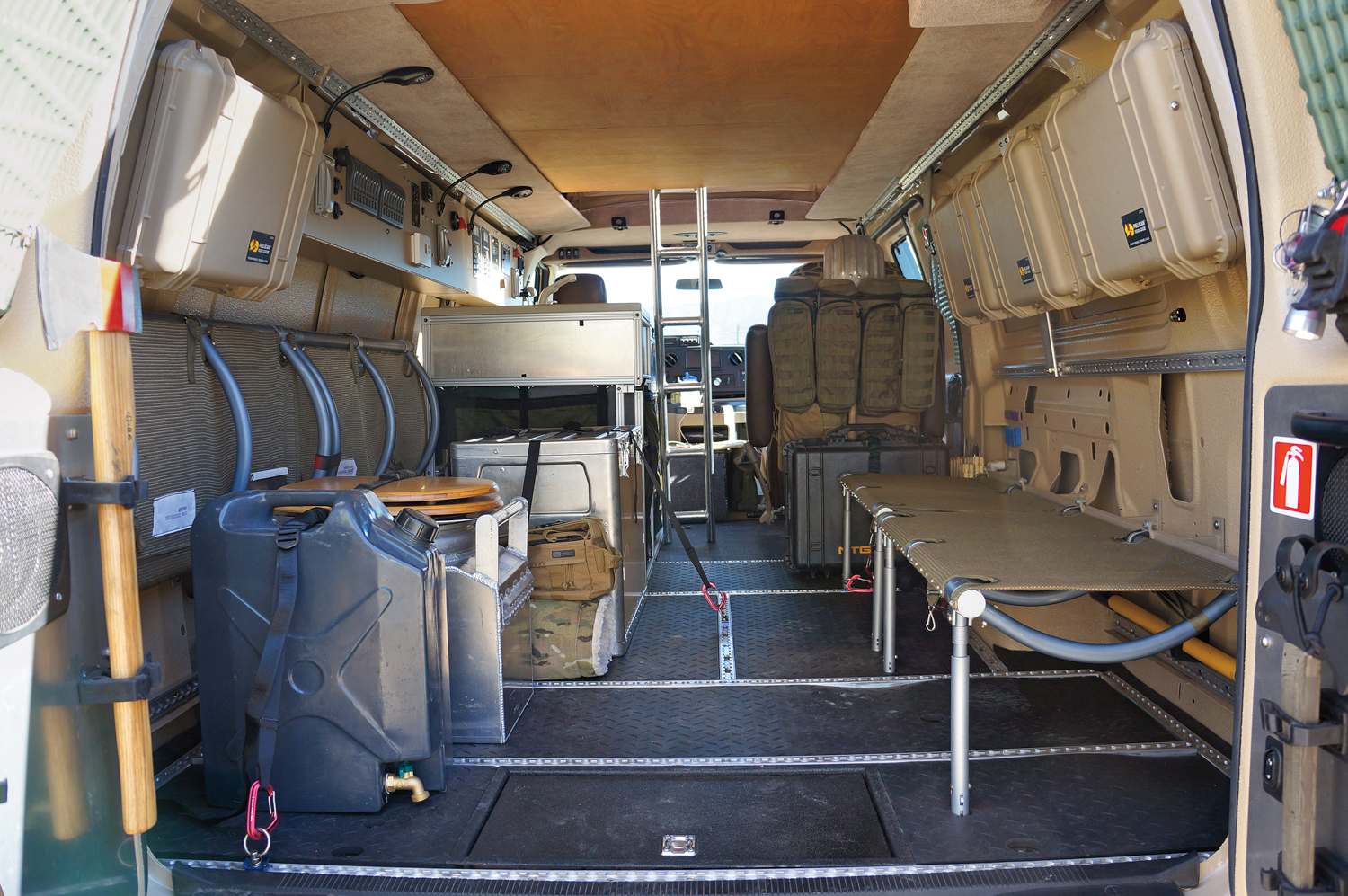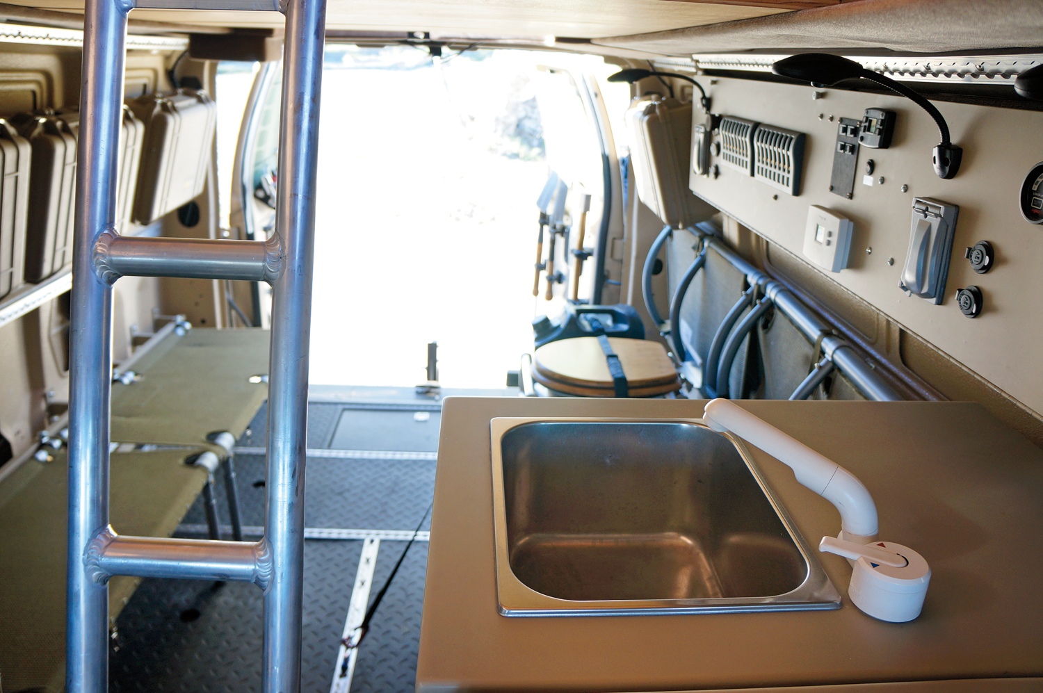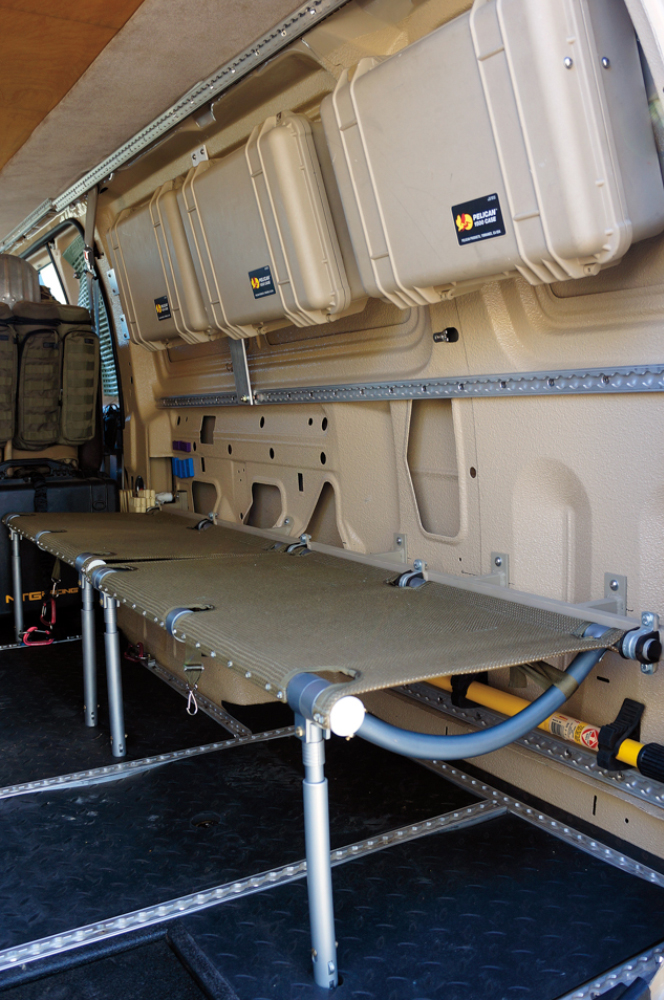 Except for the factory dash lights, all interior lights are LED. This took some ingenuity with the dome lights, which normally actuate upon opening doors. They now stay off until manually switched on. To the Aluminess roof rack, we bolted a 40-inch LED light bar up front and two 10-inch light bars to starboard and port, all sourced from Baja Designs. To maximize the interior’s versatility, AT mounted four new old stock Huey (Bell UH-1) military helicopter seats in the van. these weigh almost nothing, fold down as individual seats or together as cots, and make a perfect aft lounge and meeting area. Aluminum aircraft L-tracks throughout the van allow cargo to be secured, while off-the-shelf Pelican cases, attached to aluminum staves mounted along the interior sides (courtesy of Aluminess), provide extra storage. The Aluminess team also came through with a ladder to access the penthouse bunk.
