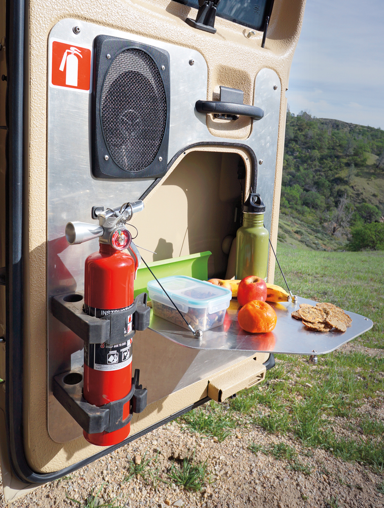 To heat the interior space and water, AT chose the Espar D5 system that runs off diesel from the fuel tank, running glycol lines around the outside of the water tank to keep the water from freezing. The glycol can be heated directly either by shore power or a generator—a nice touch. A frame of 80/20 aluminum bolted to the floor and protected by Nomex panels secures the sink and 95-liter National Luna refrigerator. Maximizing interior storage, AT integrated hinged access doors (one also serving as a fold-down table) into the aluminum barn door panels.