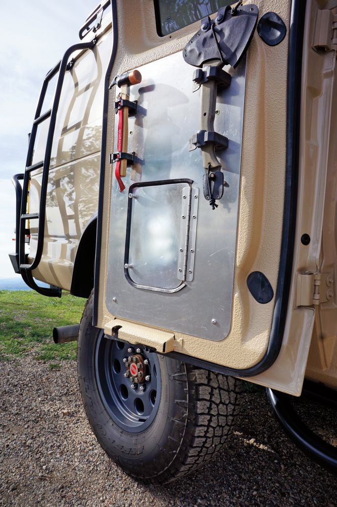 A heavy-duty steering arm and a larger diameter front sway bar with quick disconnects were added. To protect the body and provide a mounting point for the winch, I selected Aluminess Trojan front and rear bumpers. A generous sub-floor cargo hold pushed the former spare tire to the swing-out. A 46-gallon, long-range fuel tank enabled sustained travel time in the field. Other than fitting an Amsoil dual remote oil filtration system, Sportsmobile left the motor stock. A DOT-approved removable captain’s chair just inside the starboard barn doors, a custom, low profile Aluminess roof rack, and a Kyocera 185-watt solar panel were all later installed.