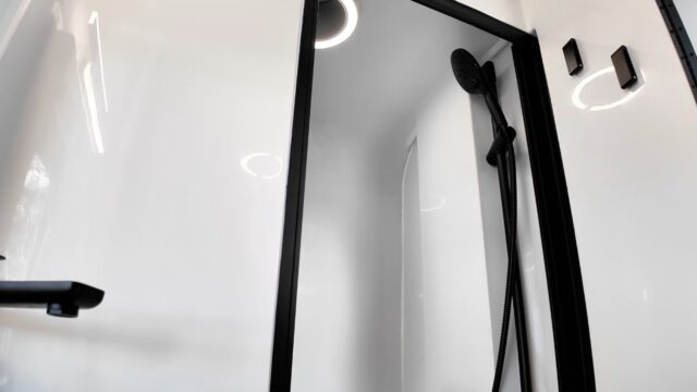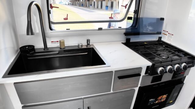 Plumbing and water systems are designed with both comfort and practicality in mind. The trailer includes a Nautilus water management panel with external shower connection, a Truma Combi Eco hot water and heater system, and capacious fresh, gray, and black water tanks. The plumbing layout and component choices indicate an effort to balance everyday convenience with the robustness needed for camping environments that may be distant from traditional utility hookups, such as the Hot Well Dunes, where the pit toilets are very well used and a bit grim, to be honest.