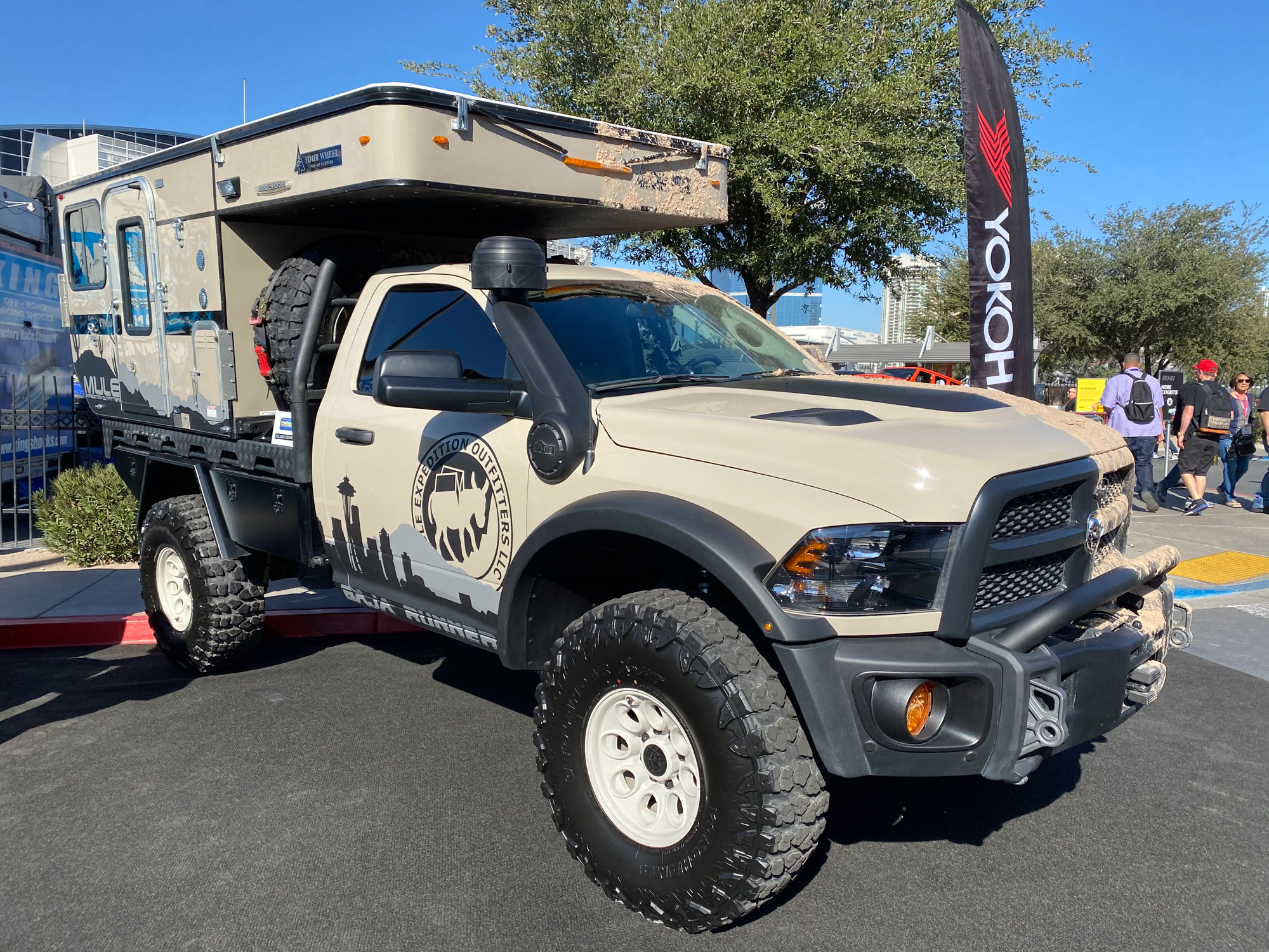I have liked the Mule Expedition Outfitters RAM with a tray-mounted Four Wheel Camper since it was a concept vehicle. The tan accents and liberal use of AEV kit make it a thoughtful and competent traveler. mule-expedition-outfitters