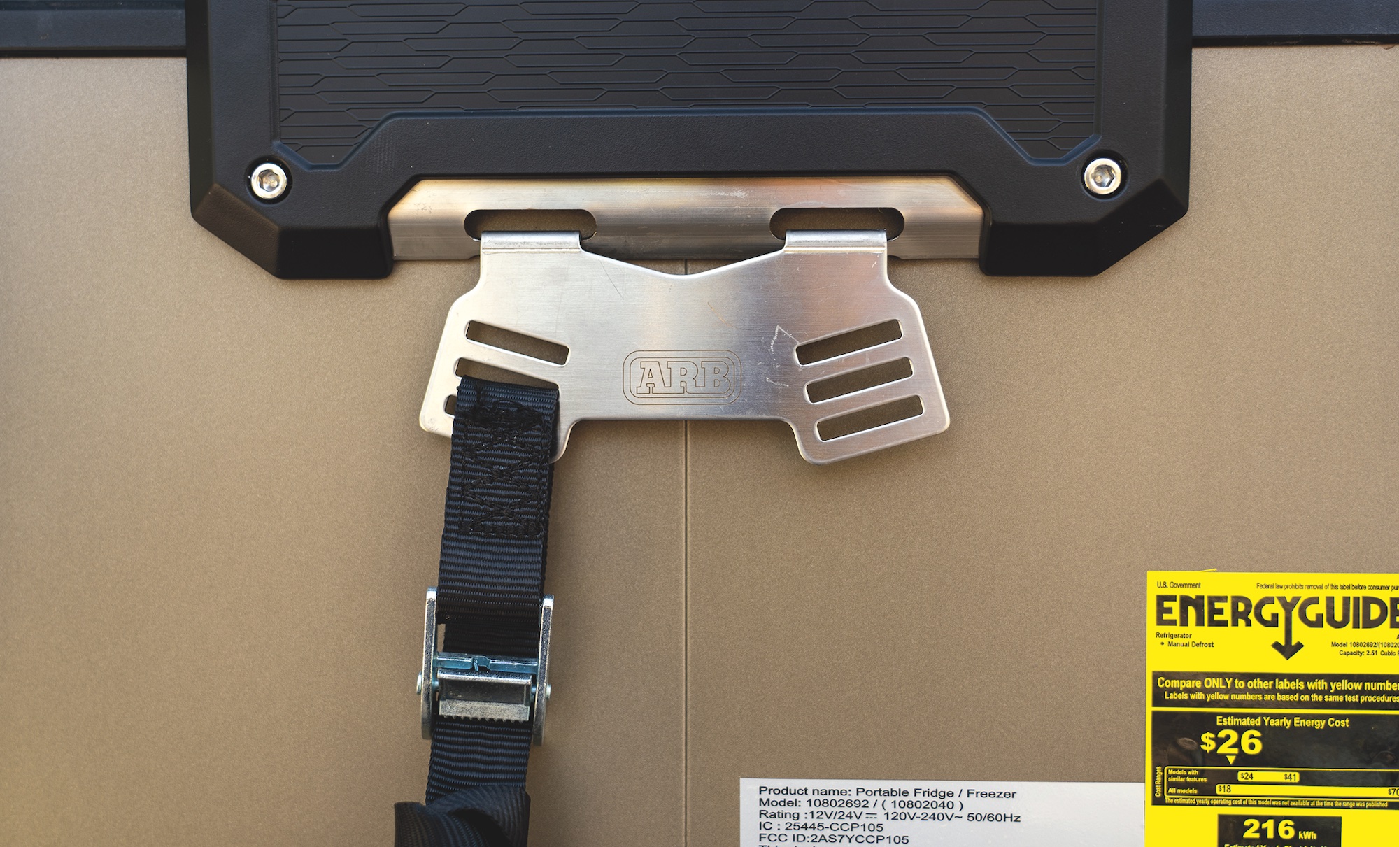 Left to Right: The Zero is a seriously robust unit, armored for impacts and abrasion. The insulated freezer divider can be removed to create a massive fridge cavity. The ARB has the best tie-down solution of the test, with heavy-duty stainless steel brackets.