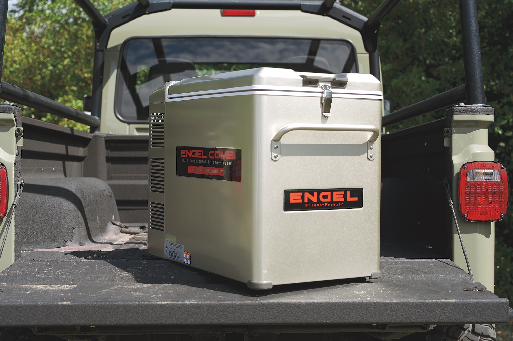Upon initial review, the Engel’s modest appearance belies its strengths, with a stamped, powder-coated steel shell and molded plastic interior. The unit is notably compact for the volume, lacking anything non-essential (no bulky bumpers or bottle openers, etc.) The handles, from our experience, are only suitable for carrying the unit, not proper lashing. For that, there are robust brackets (sold separately) that affix to the factory captive inserts. This new-model Engel features significantly more detail on its display, including the temperature of the cabinet, the set temp, and the battery state. Another notable feature is an adjustable low-voltage disconnect, which is a first for the brand. The cooling function is simple and robust, with the fridge zone factory set to 0-5°C, and the freezer adjustable from -18°C to +10°C. The size of the fridge can be adjusted to three different volumes, including fridge only.