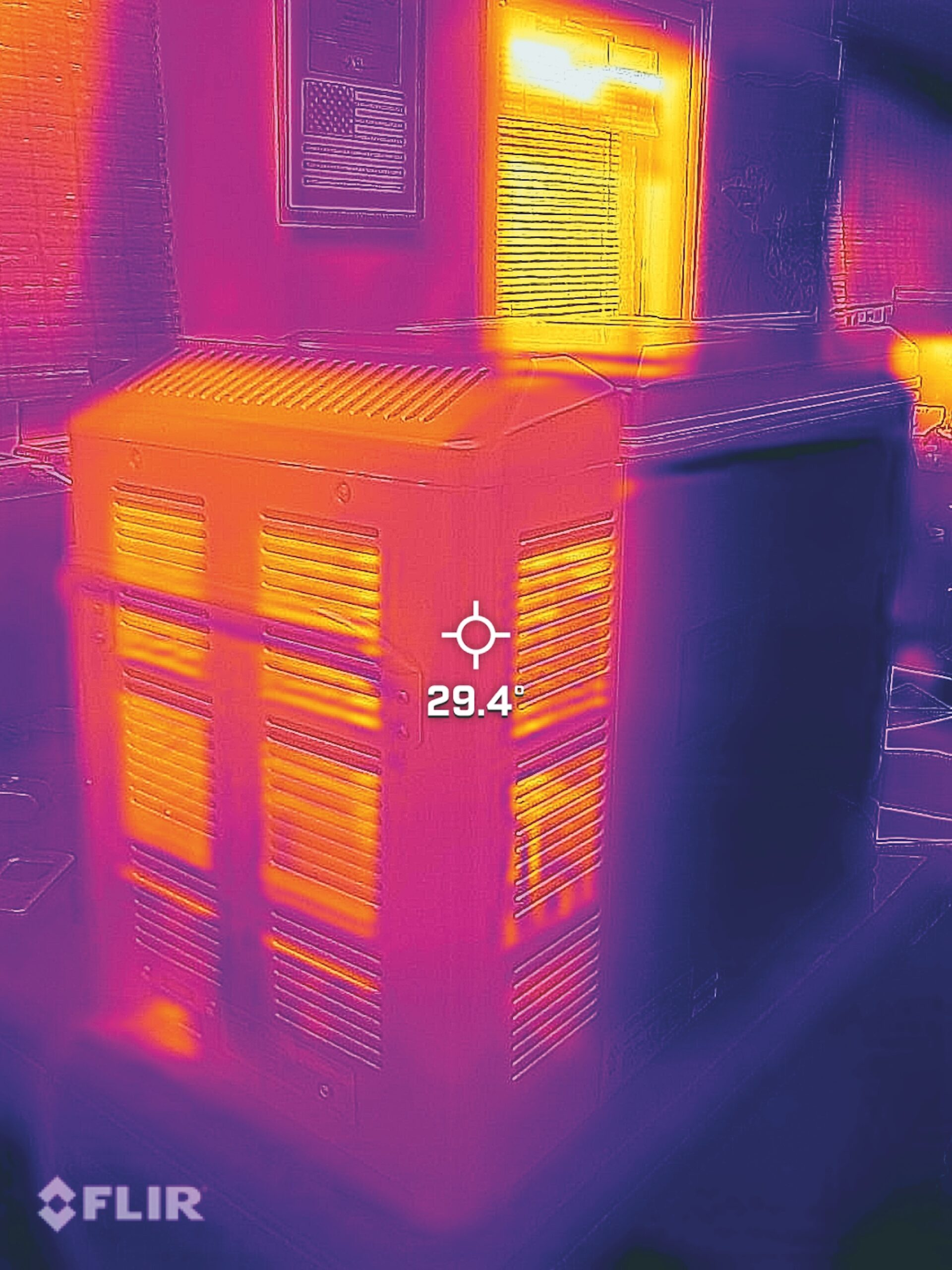 Additional tests included a decibel measurement of the compressor during peak cooling to determine fan, vibration, and other sounds that contribute to a noisy sleeping environment. We also took four cooling vent temp checks with a thermal IR gauge to determine how hot the units ran (to help the buyer consider required cooling spacing and airflow), and we captured Forward Looking InfraRed (FLIR) thermal images of the fridges to look for concentrated heat zones and potential cooling loss areas (for example, around the lid).