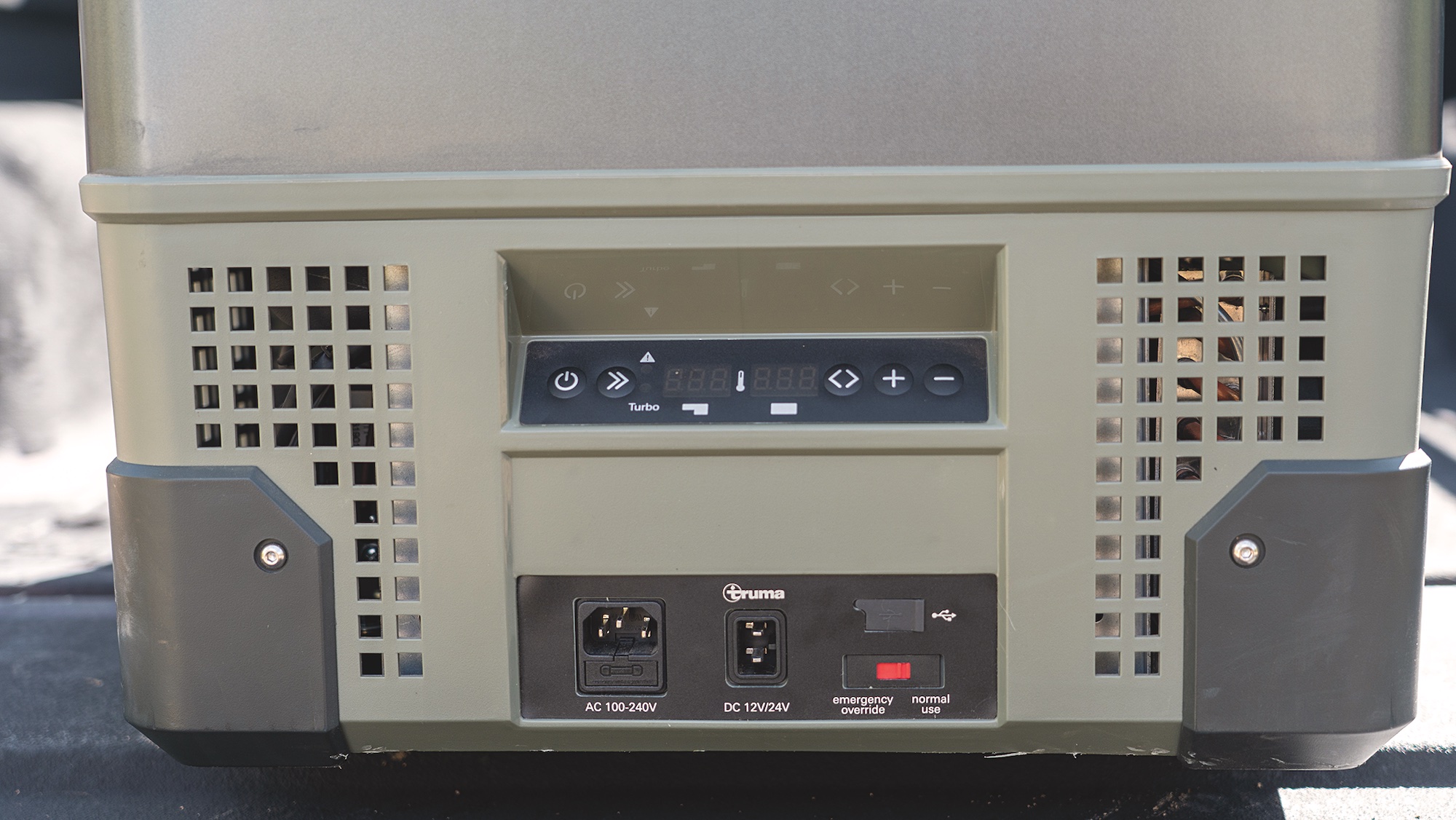 Left to Right: The Truma is a combination of high-strength plastic and a metal side band. The handles are notable in how they fold into the sides of the fridge. The traditional layout of a combination fridge is useful, and the freezer divider can be removed. The Truma has a comprehensive display and power options, including two 12-volt inputs.