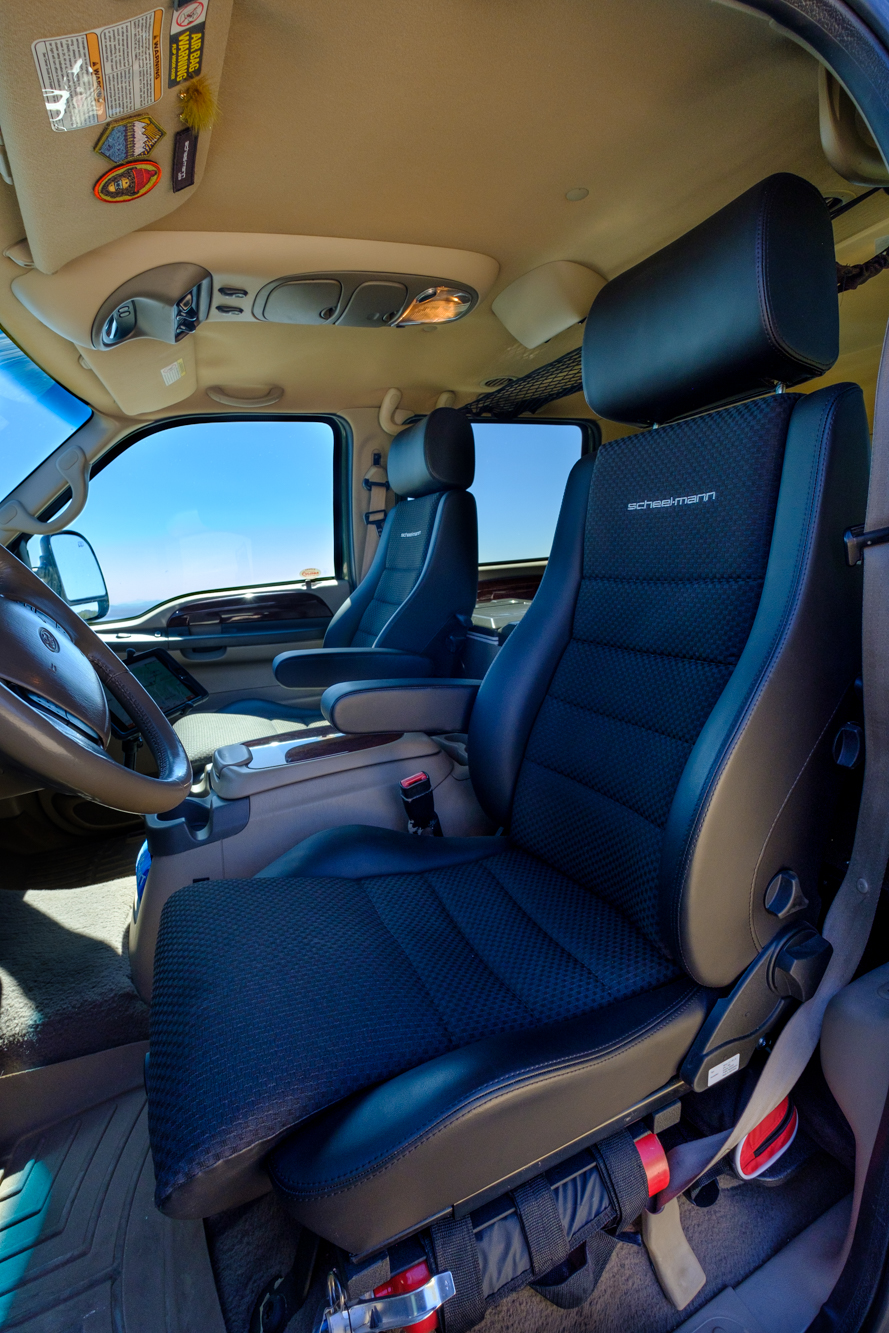 After the procedure, and much to my dismay, I found the one activity that was guaranteed to induce debilitating pain was driving. Every vehicle I tried was troublesome, but my 2000 Excursion was absolutely unbearable. Even a trip across town would cause my sciatic pain to flare, and a long journey required constant stops, mountains of ibuprofen, and admittedly a few tears. I was beside myself. I knew that if there was any chance of me continuing to do what I love, I’d need to find a way to support my back, and thus the research began. I read articles and blogs, tried braces and cushions, and even considered a new vehicle, but nothing solved the problem. That’s when I remembered the orthopedic seats I saw in a Maltec Camper at Overland Expo East. They were from a company called Scheel-Mann, and after a little research I decided to give their U.S. office a call.