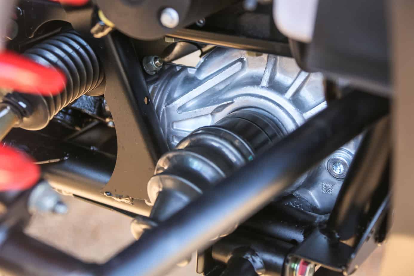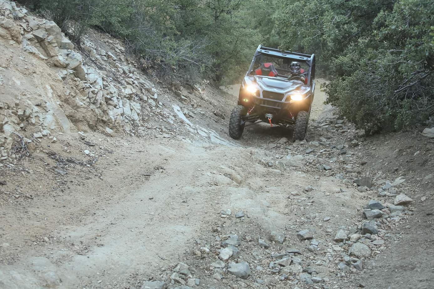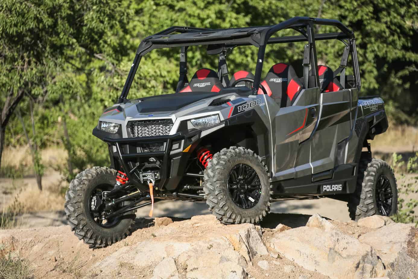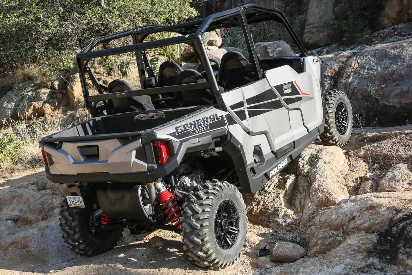 The width and overall length is tidy, allowing the General to fit between trees and rocks that a standard 4WD would need to negotiate. It has a rear locking differential and a front hilliard-style locker which uses a cage with rollers and a magnetic coil that engages the axles automatically. When combined with the aggressive tires, the Polaris becomes exceedingly capable, besting nearly every stock 4WD we have ever tested on our evaluation loop. There are a few notable limitations, principally the firm anti-sway bars, which constrains articulation in cross-axle terrain. This causes a corner of the General to lift, often dramatically, thus reducing stability and traction, although it is rarely a real concern given the low center of gravity. Trail prowess is genuinely exceptional, and when combined with excellent ride quality, it is easy to see long days in the dirt and equally wide grins.