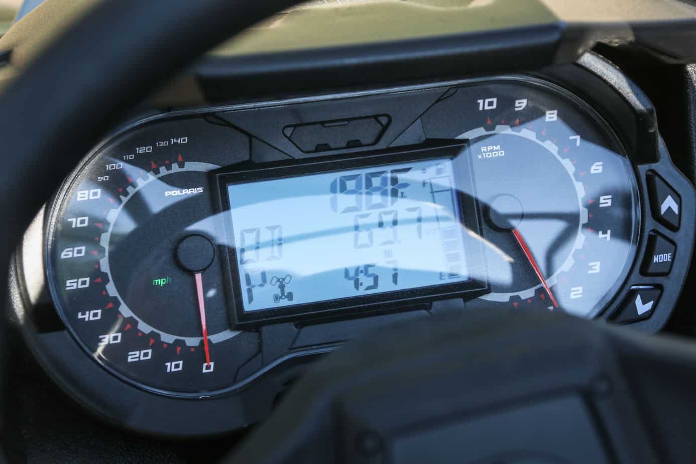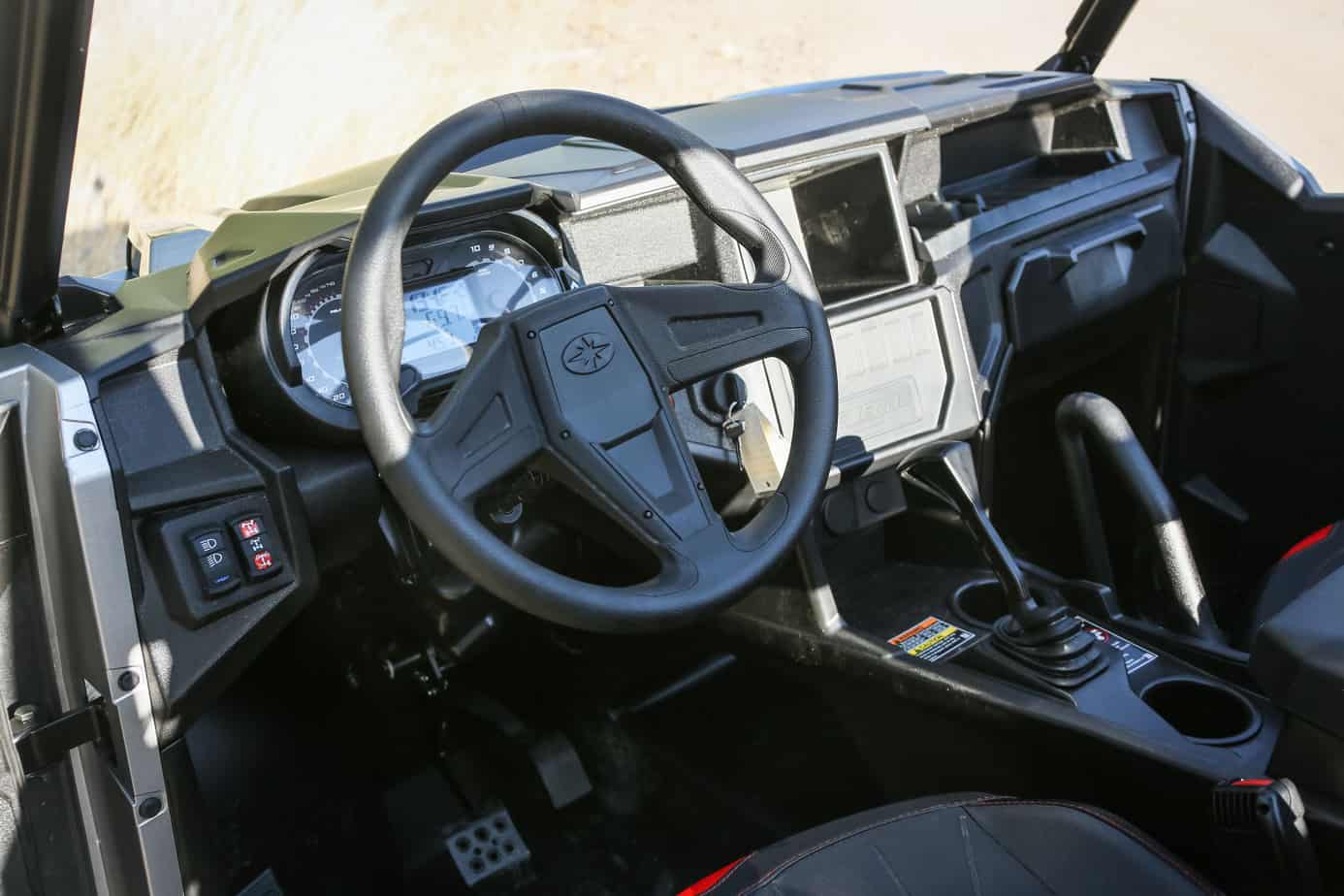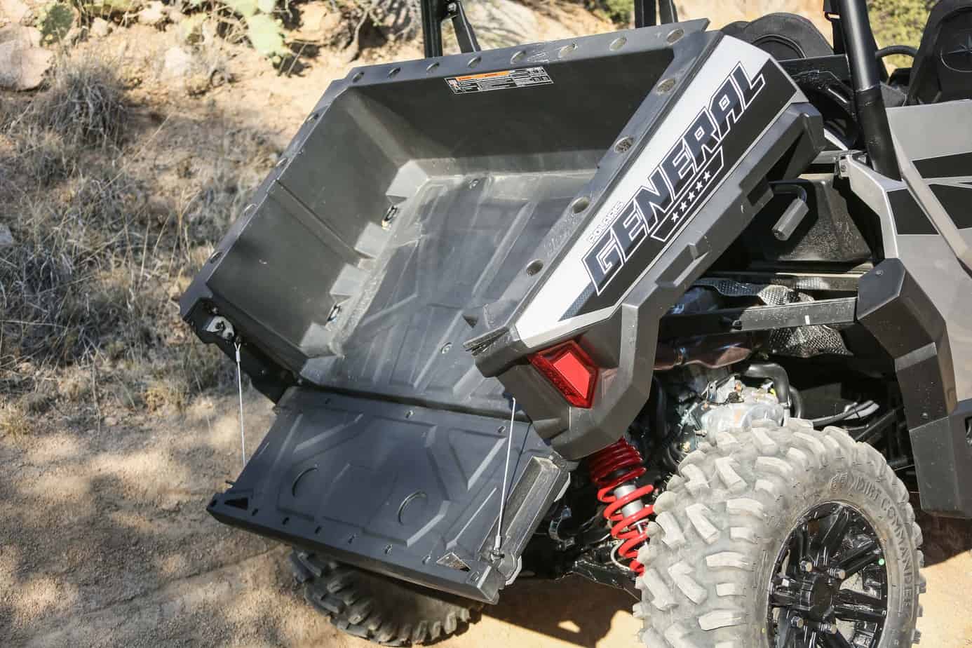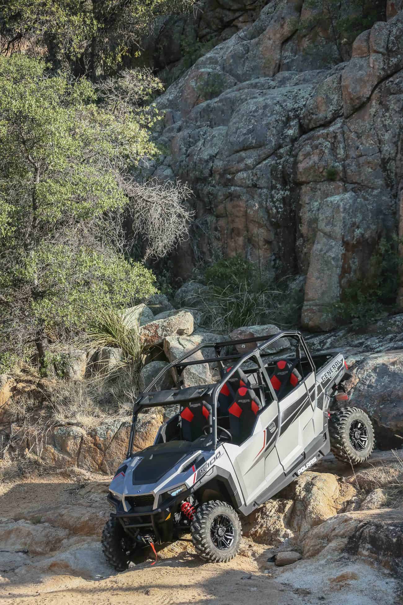 Off-highway, the General is an impressive machine, boasting 12 inches of ground clearance, 12.25 inches of front suspension travel, and 13.2 inches of rear travel. The belt-driven, variable transmission includes both a high-range and low-range gear set, allowing for short stints at highway speeds (we tested it up to 65 mph) and low speed technical work. It is important to note that the CVT cannot be “crawled” like a traditional automatic with torque converter, so left-foot braking and slightly higher rpms (and speed) are needed to protect the belt. The tires are 27 inches in diameter and the wheel opening should easily accommodate up to a 31-inch tire. The wheelbase is 113 inches, only a few shy of the Wrangler Rubicon, providing stable handling and excellent hill climbing.
