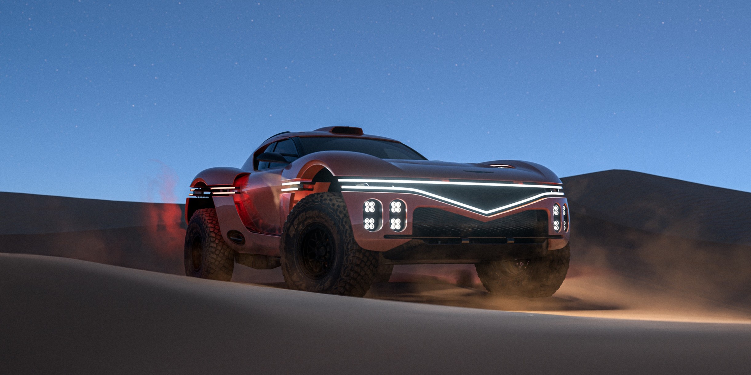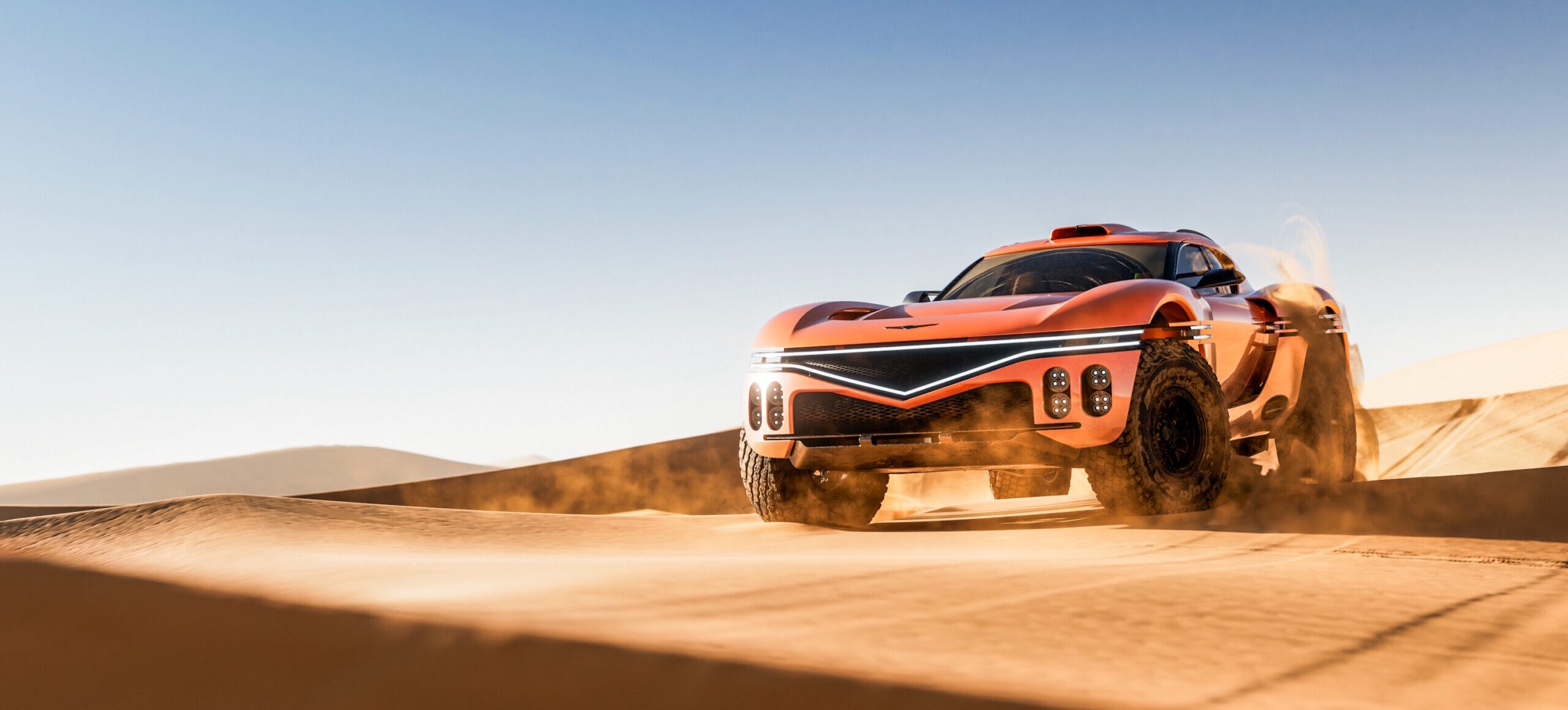 Another option would be a beach buggy with a roof. Affordable, fun, and remarkably capable in sand, a buggy is arguably the purest expression of desert travel. Traditional touring cars also have their appeal, especially for long-distance comfort and speed, but their excellence on pavement is matched only by their general incompetence once the road turns rough. If only there were something in between: a vehicle with real power, genuine off-road ability, and the kind of presence that doesn’t just complement the scenery, but threatens to eclipse it. That vehicle may be on the horizon.